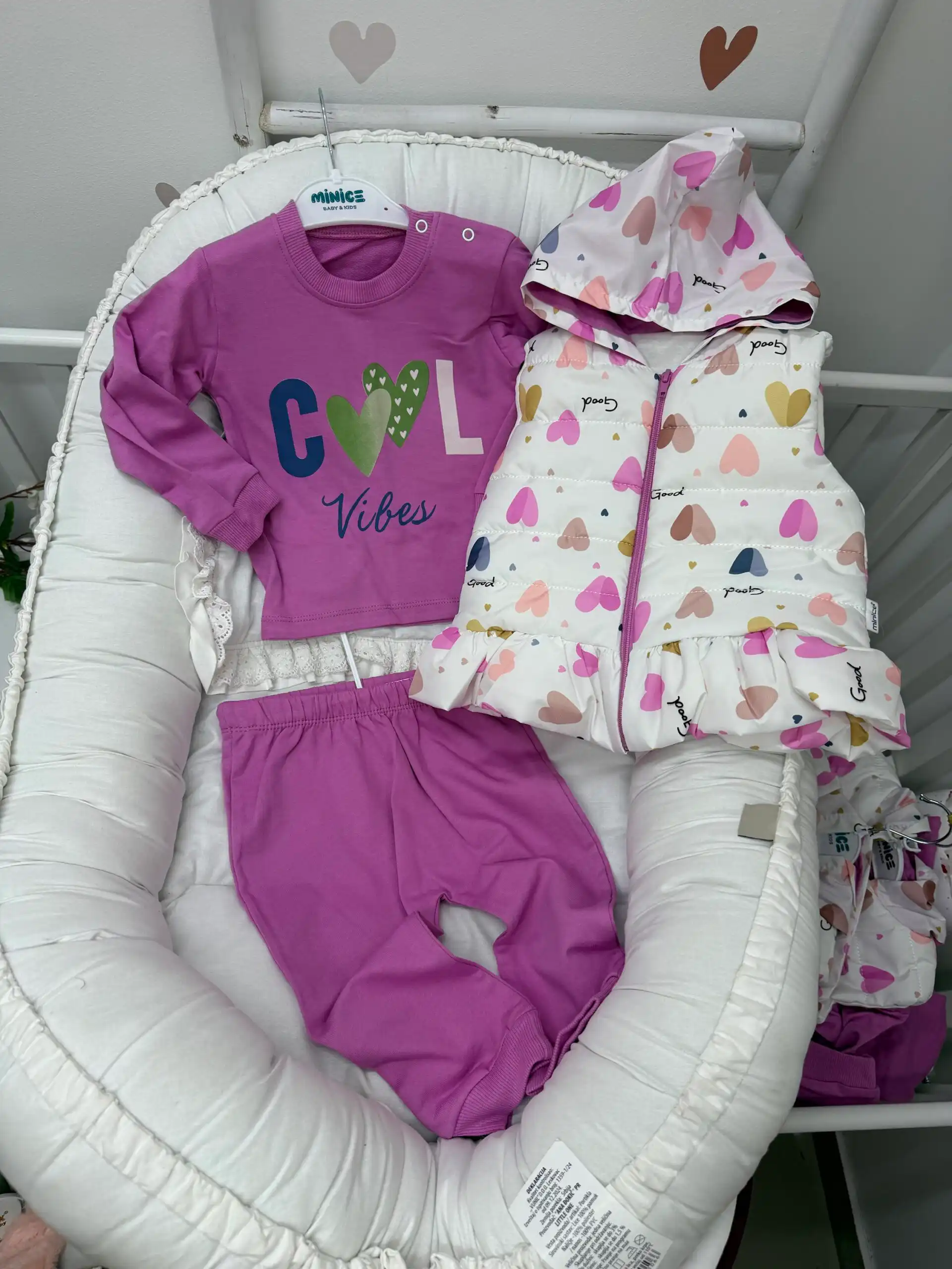 Komplet za devojčice koji uključuje bluzu, udobnu trenerku i lagani šuškavi prsluk predstavlja idealnu kombinaciju za prelazne i hladnije dane.Prsluk kao treći sloj daje modern i funkcionalan izgled i lako se kombinuje sa ostalim komadima 👦.