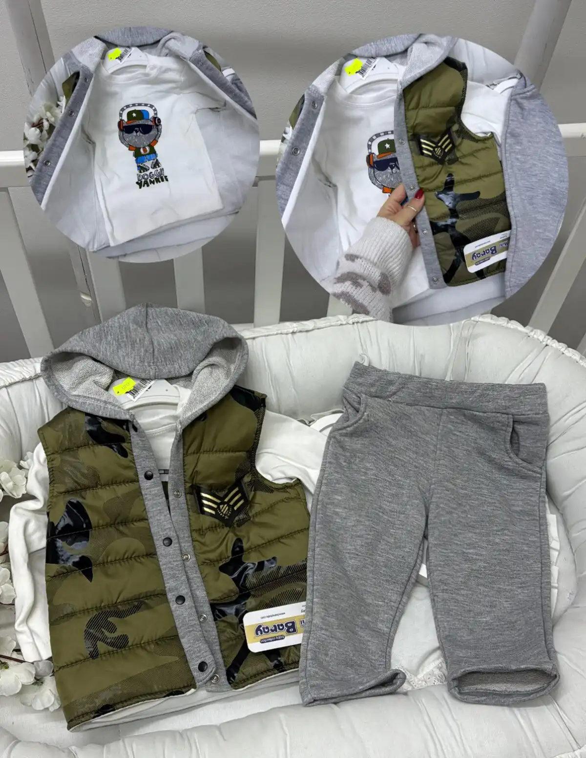 Komplet za dečake koji uključuje bluzu, udobnu trenerku i lagani šuškavi prsluk predstavlja idealnu kombinaciju za prelazne i hladnije dane. . Šuškavi prsluk kao treći sloj daje modern i funkcionalan izgled i lako se kombinuje sa ostalim komadima 👦.