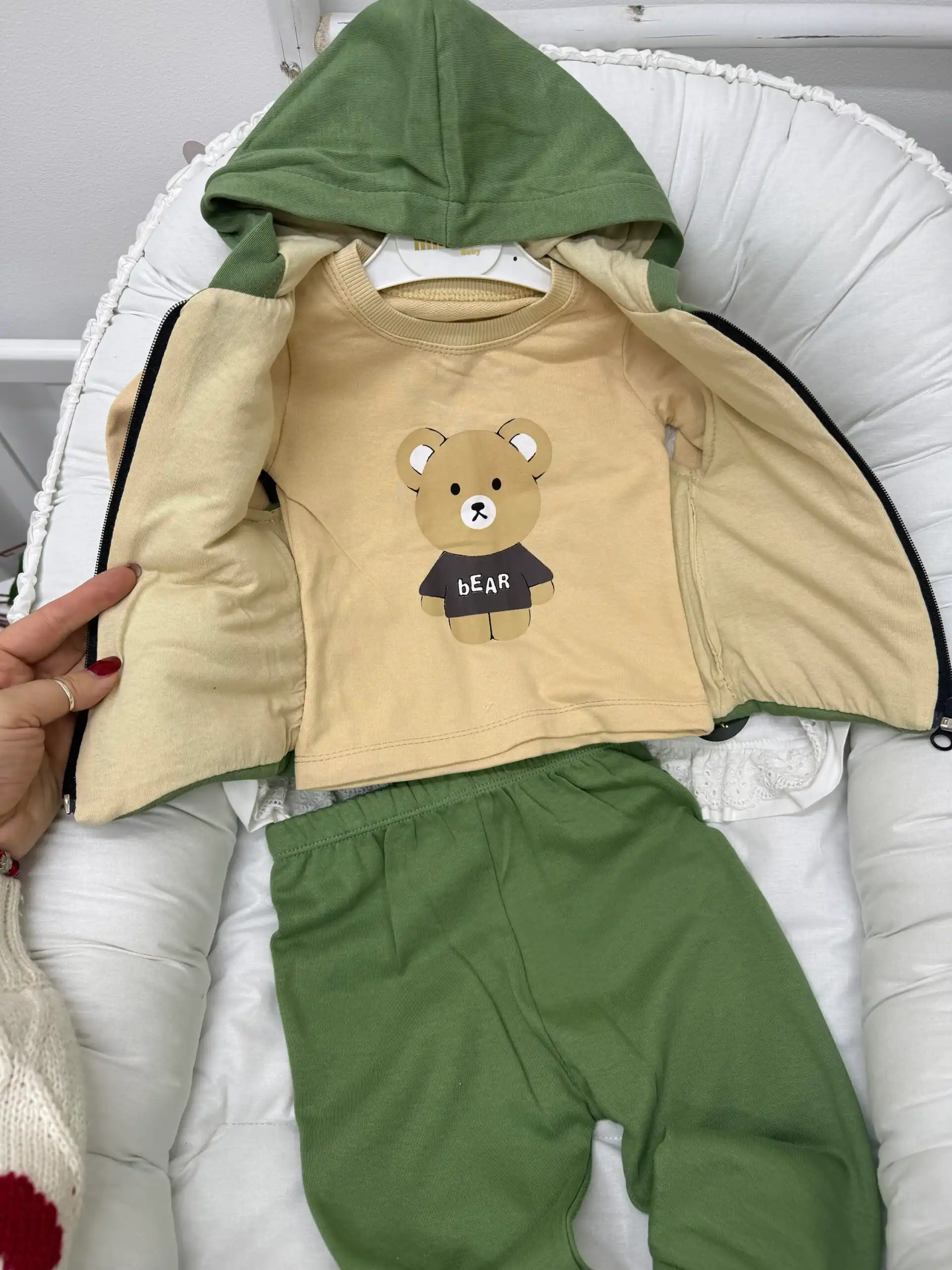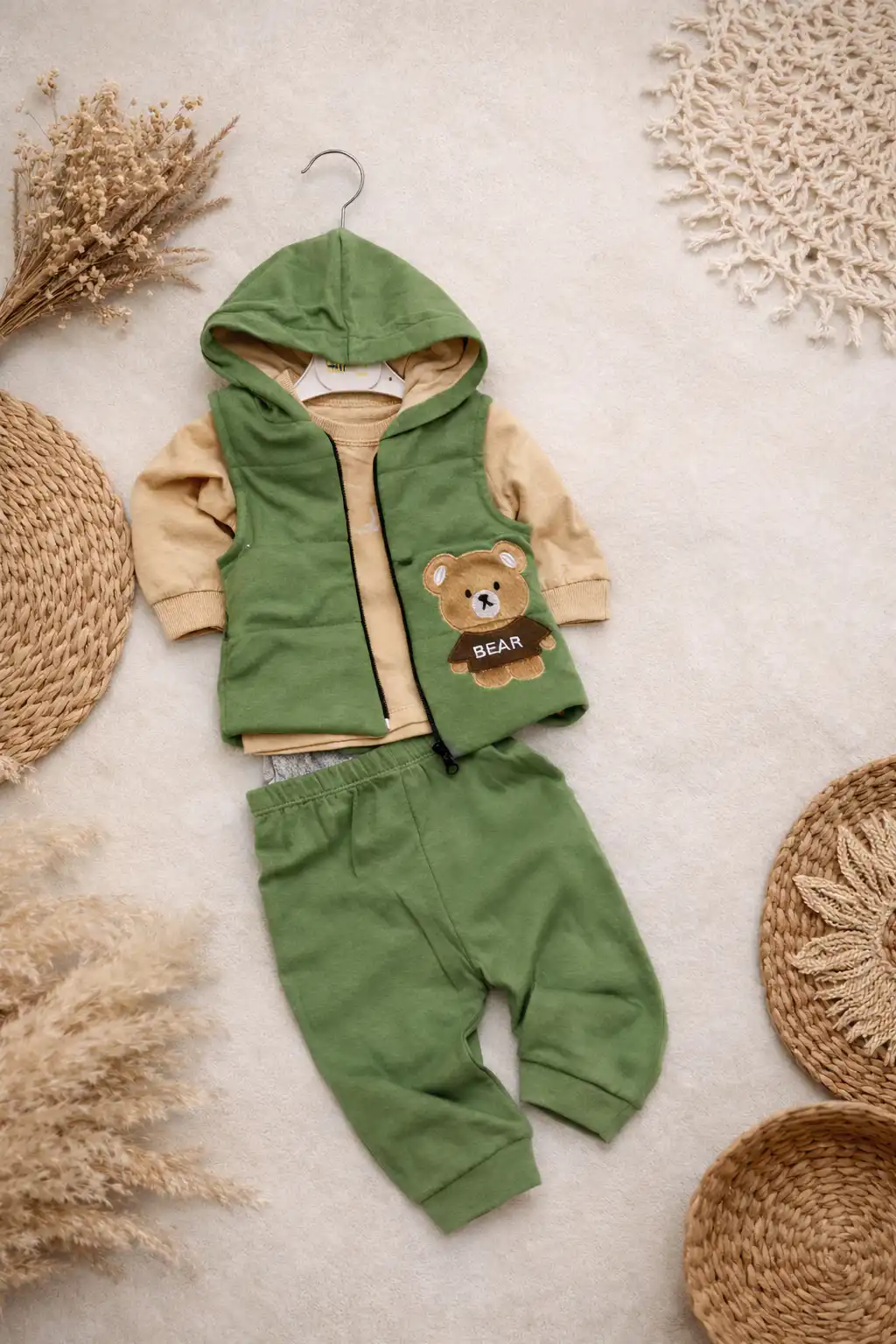 Komplet za dečake koji uključuje bluzu, udobnu trenerku i lagani pamučni prsluk predstavlja idealnu kombinaciju za prelazne i hladnije dane.Praluk kao treći sloj daje modern i funkcionalan izgled i lako se kombinuje sa ostalim komadima 👦.