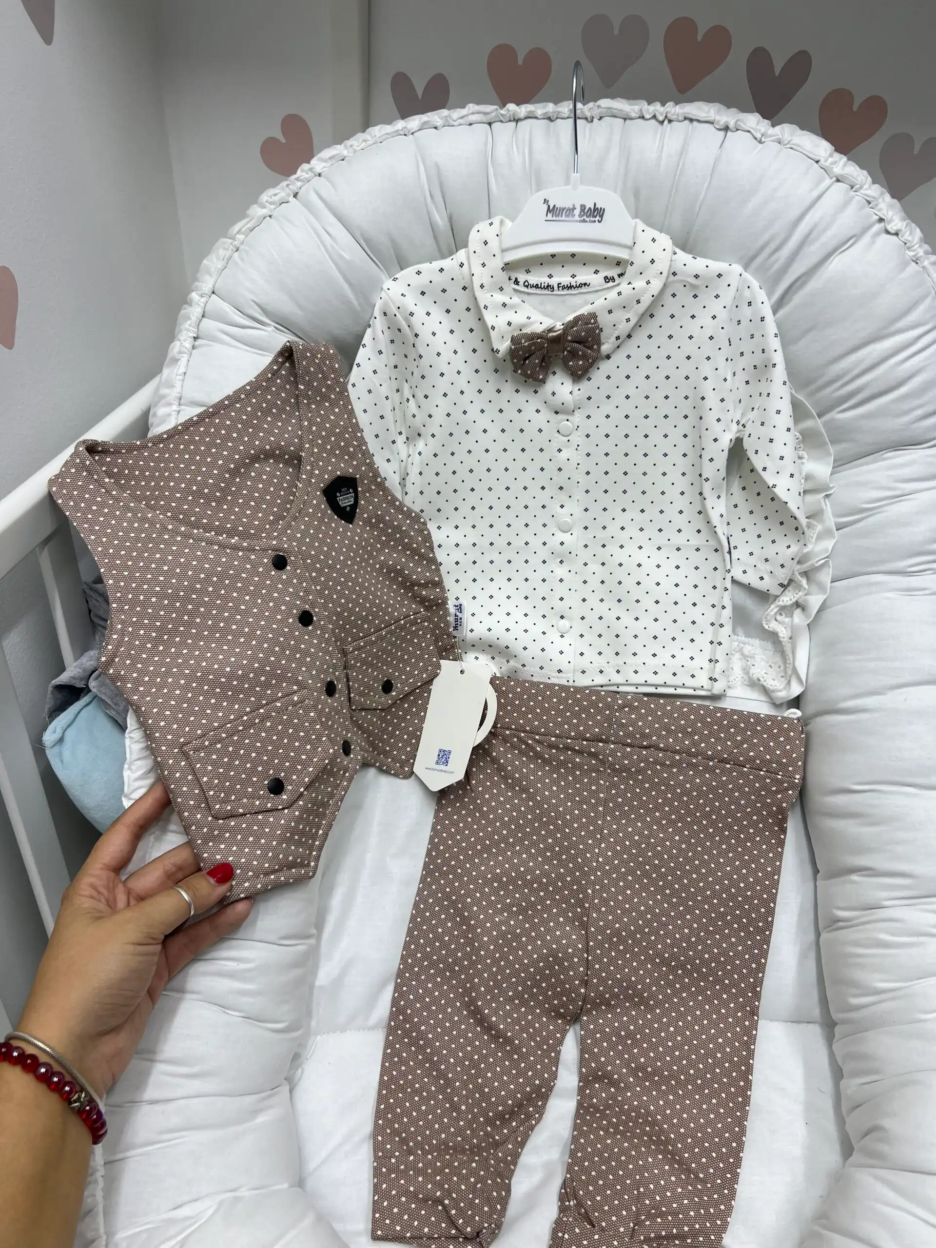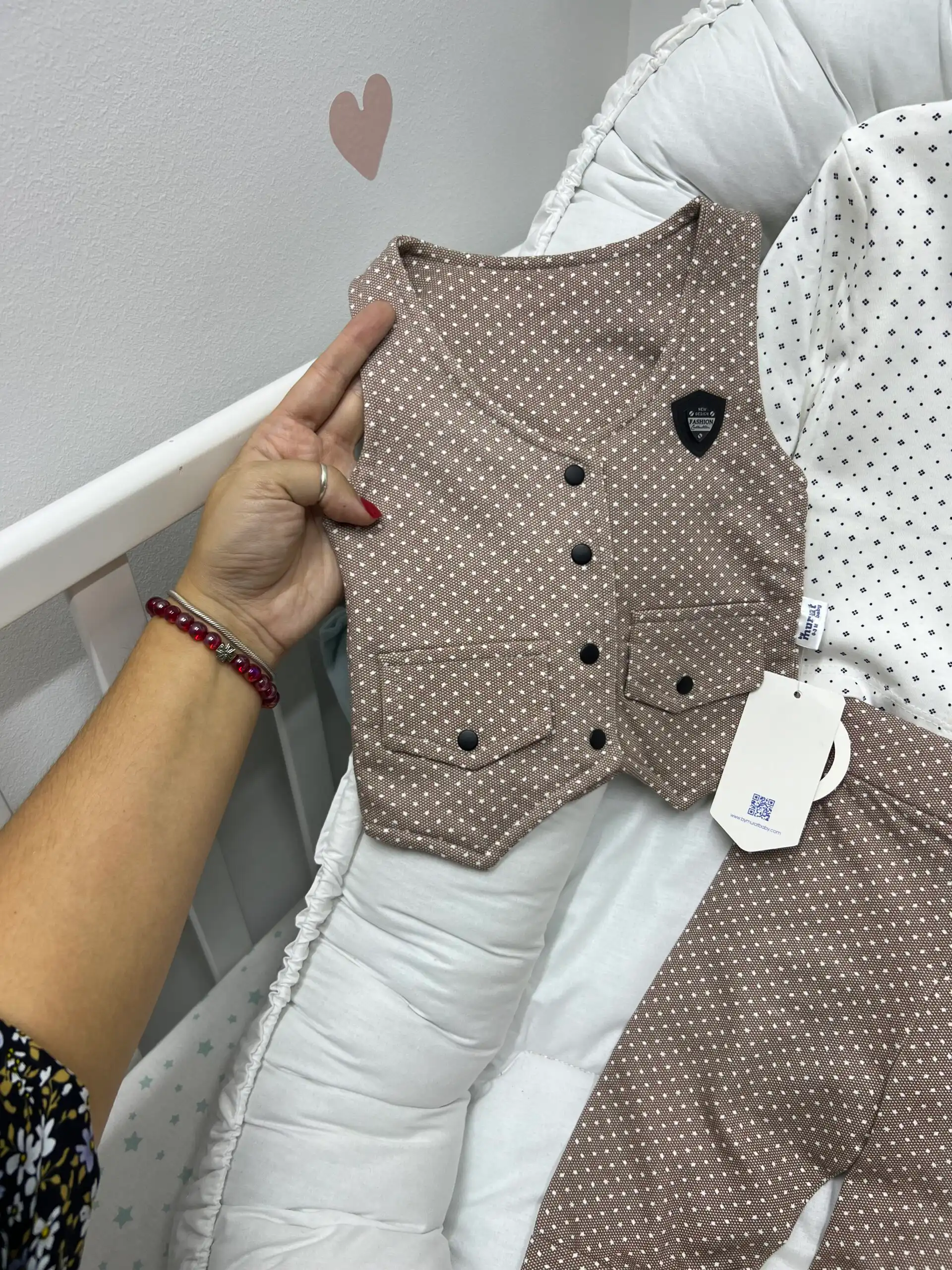 Svečani, a pamučni komplet: benkica na raskopčavanje + leptir mašnica + pantalone + prsluče 👶🤍🎀
