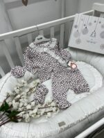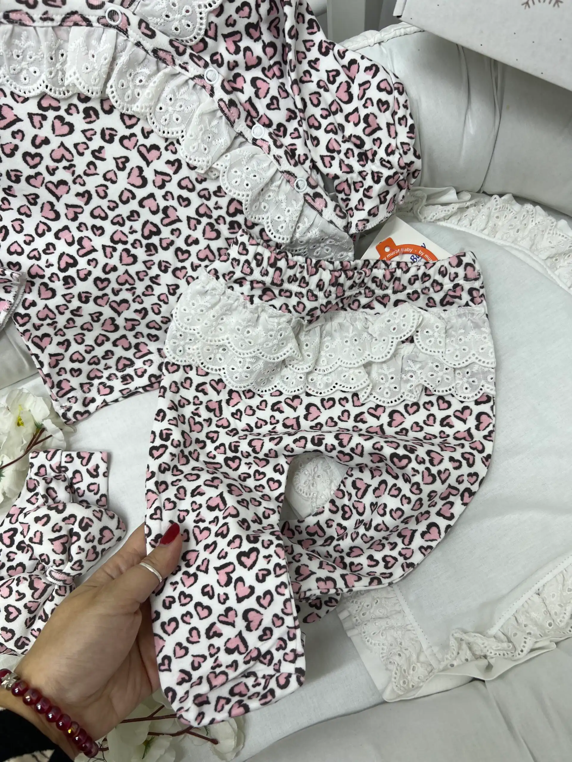 Bluzica je izrađena od mekanog i kvalitetnog pamuka, ukrašena finom pamučnom čipkom koja daje romantičan i sofisticiran izgled. Pantalone sa diskretnim detaljima čipke upotpunjuju celinu, dok rukavice i trakica dodatno naglašavaju nežnost kompleta 🌿
