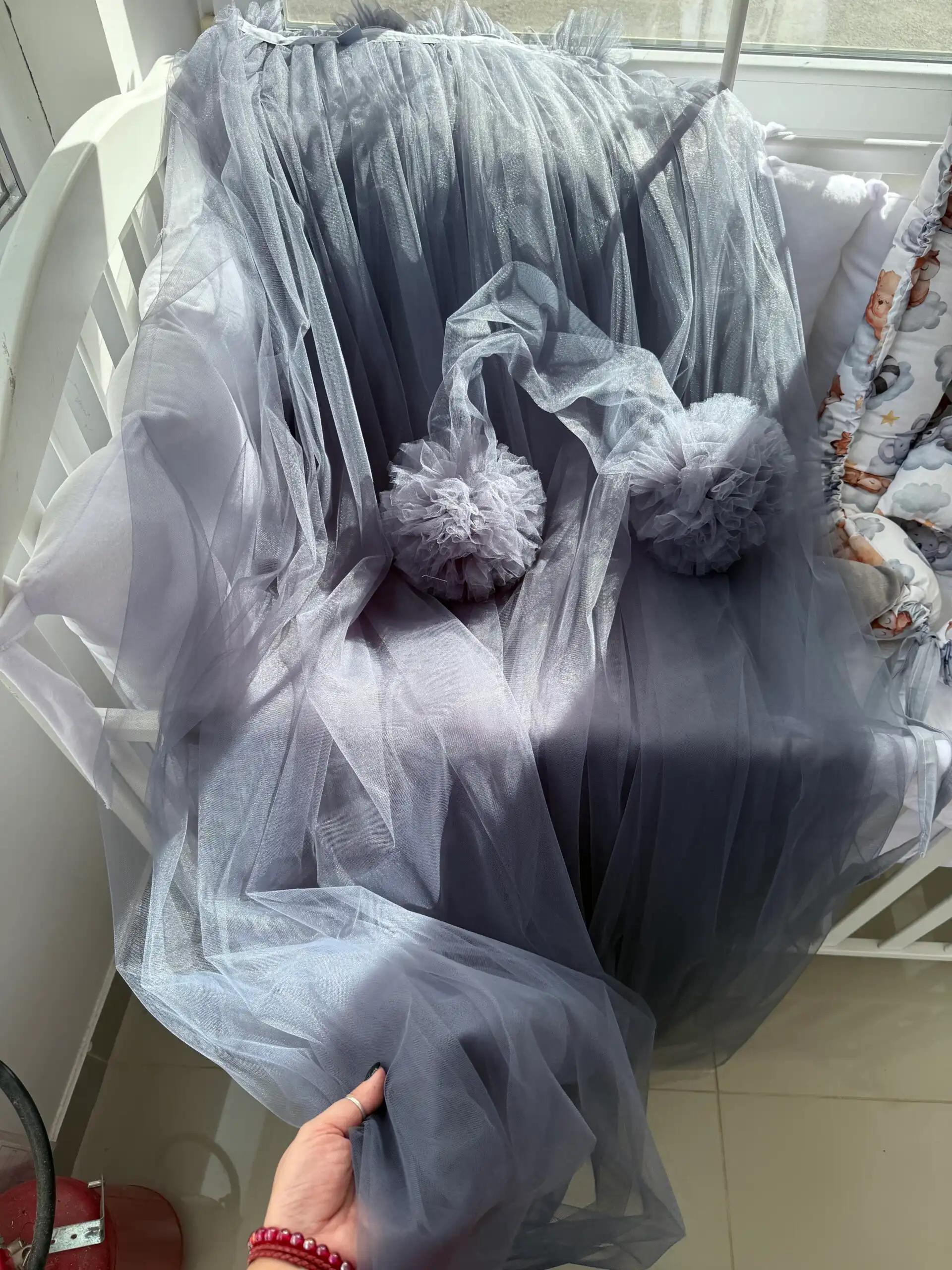 👶💖 Baldahin za krevetac – Sivi 🎀 Šiven od mekanog tila, ovaj baldahin pruža nežnu zaštitu za vaše novorođenče . Osim što štiti od prašine i insekata, istovremeno je i prelep dekorativni dodatak koji krevetac pretvara u bajkovito utočište 🌟👼.
