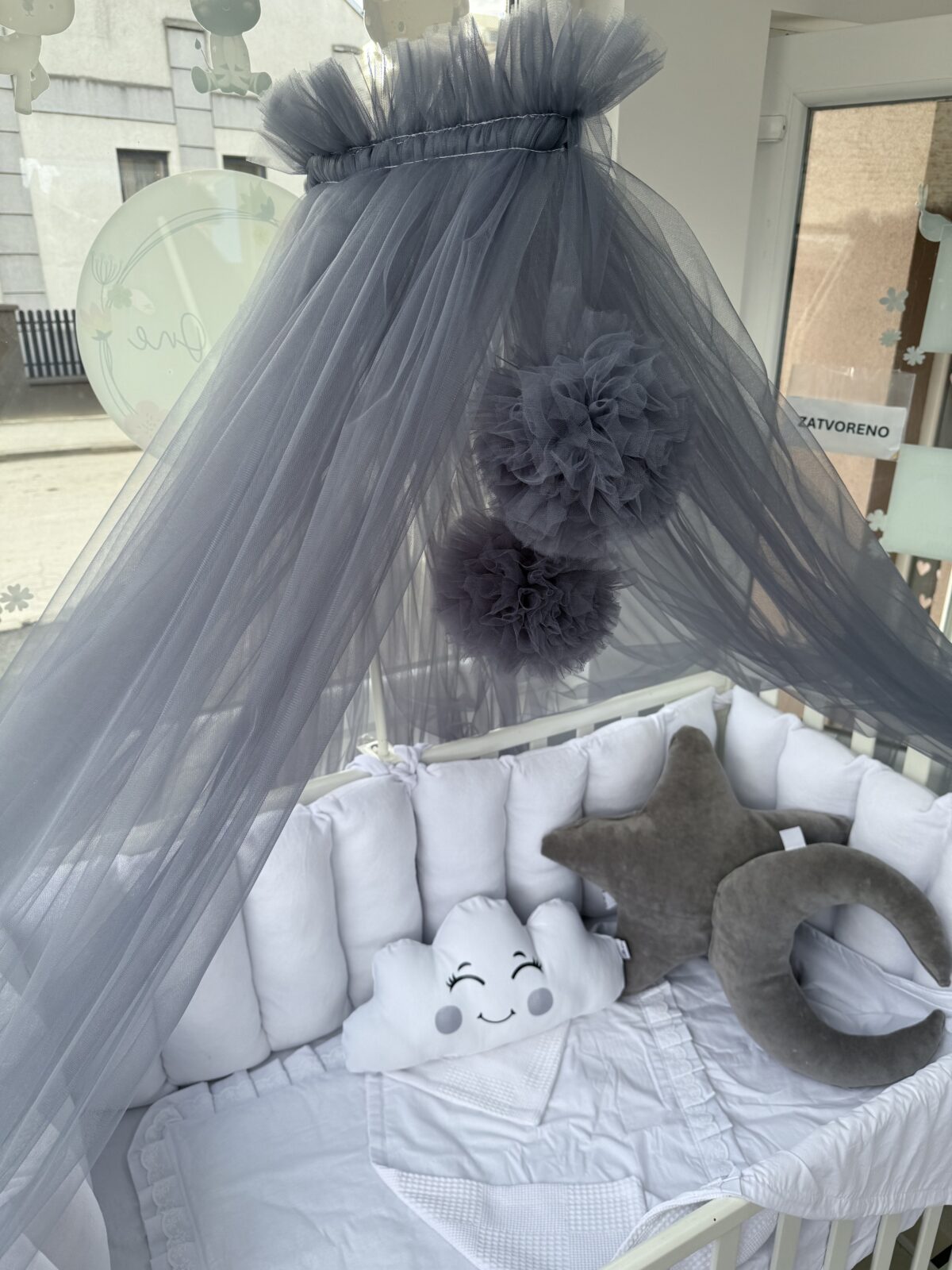 👶💖 Baldahin za krevetac – Sivi 🎀 Šiven od mekanog tila, ovaj baldahin pruža nežnu zaštitu za vaše novorođenče . Osim što štiti od prašine i insekata, istovremeno je i prelep dekorativni dodatak koji krevetac pretvara u bajkovito utočište 🌟👼.