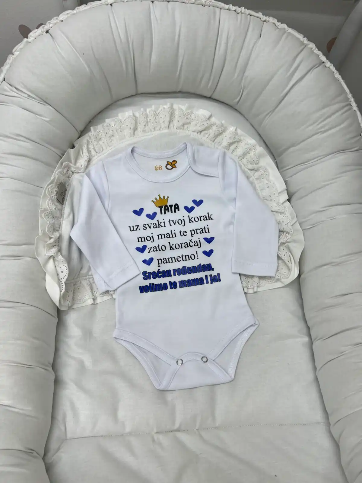 Pamučni bodi sa natpisom izrađen je od kvalitetnog, mekanog pamuka koji je nežan prema bebinoj osetljivoj koži. Praktičan kroj omogućava lako oblačenje i presvlačenje, dok simpatičan natpis daje poseban i razigran izgled. Idealan je za svakodnevne kombinacije i lako se uklapa uz pantalone, helanke i trenerkice. 🧸🌿 Sastav : 100% pamuk Proizvođač: M&A Kvalitet kontrolisao: Vulin DOO, Leskovac Održavanje: u skladu sa deklaracijom koja se nalazi na proizvodu