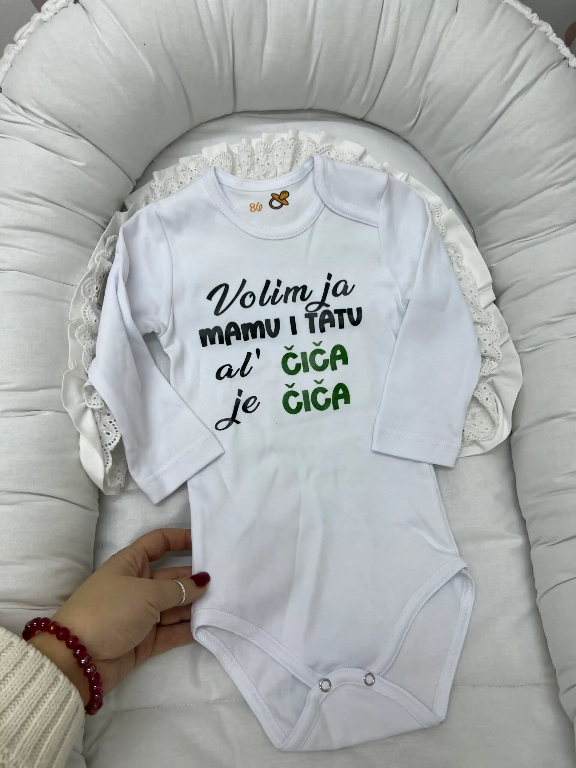 Pamučni bodi sa natpisom izrađen je od kvalitetnog, mekanog pamuka koji je nežan prema bebinoj osetljivoj koži. Praktičan kroj omogućava lako oblačenje i presvlačenje, dok simpatičan natpis daje poseban i razigran izgled. Idealan je za svakodnevne kombinacije i lako se uklapa uz pantalone, helanke i trenerkice. 🧸🌿 Sastav : 100% pamuk Proizvođač: M&A Kvalitet kontrolisao: Vulin DOO, Leskovac Održavanje: u skladu sa deklaracijom koja se nalazi na proizvodu