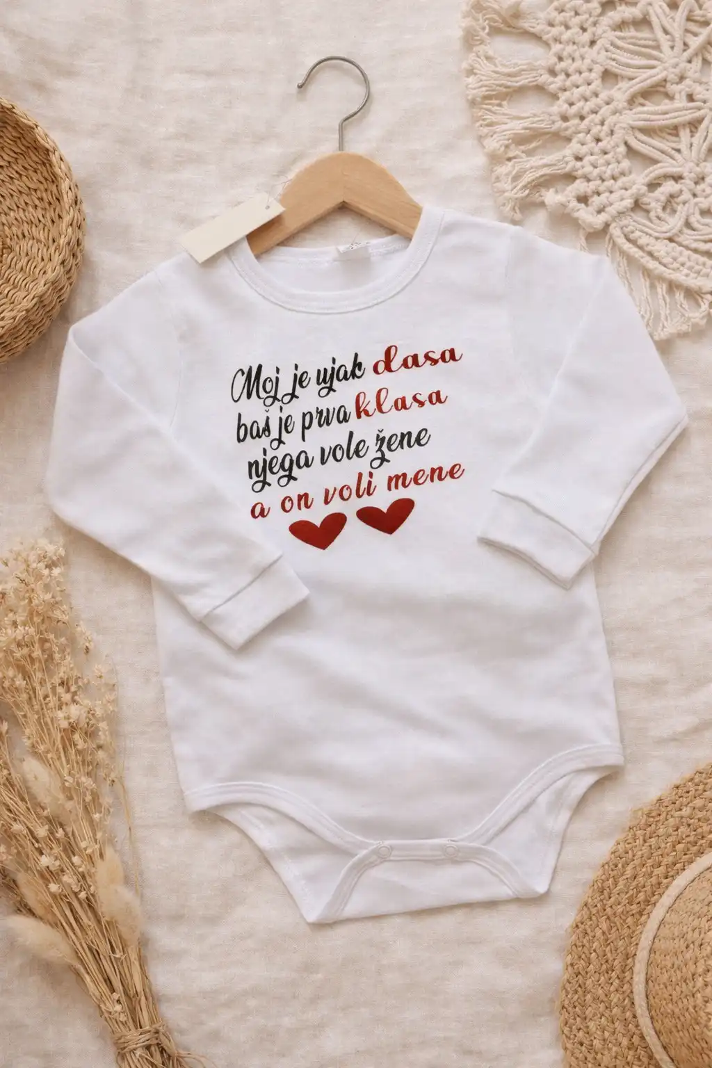 Pamučni bodi za bebe sa natpisom savršen je izbor za svakodnevno nošenje i posebne trenutke. Izrađen od kvalitetnog, mekog pamuka, pruža maksimalnu udobnost i nežnost na osetljivoj bebinoj koži.