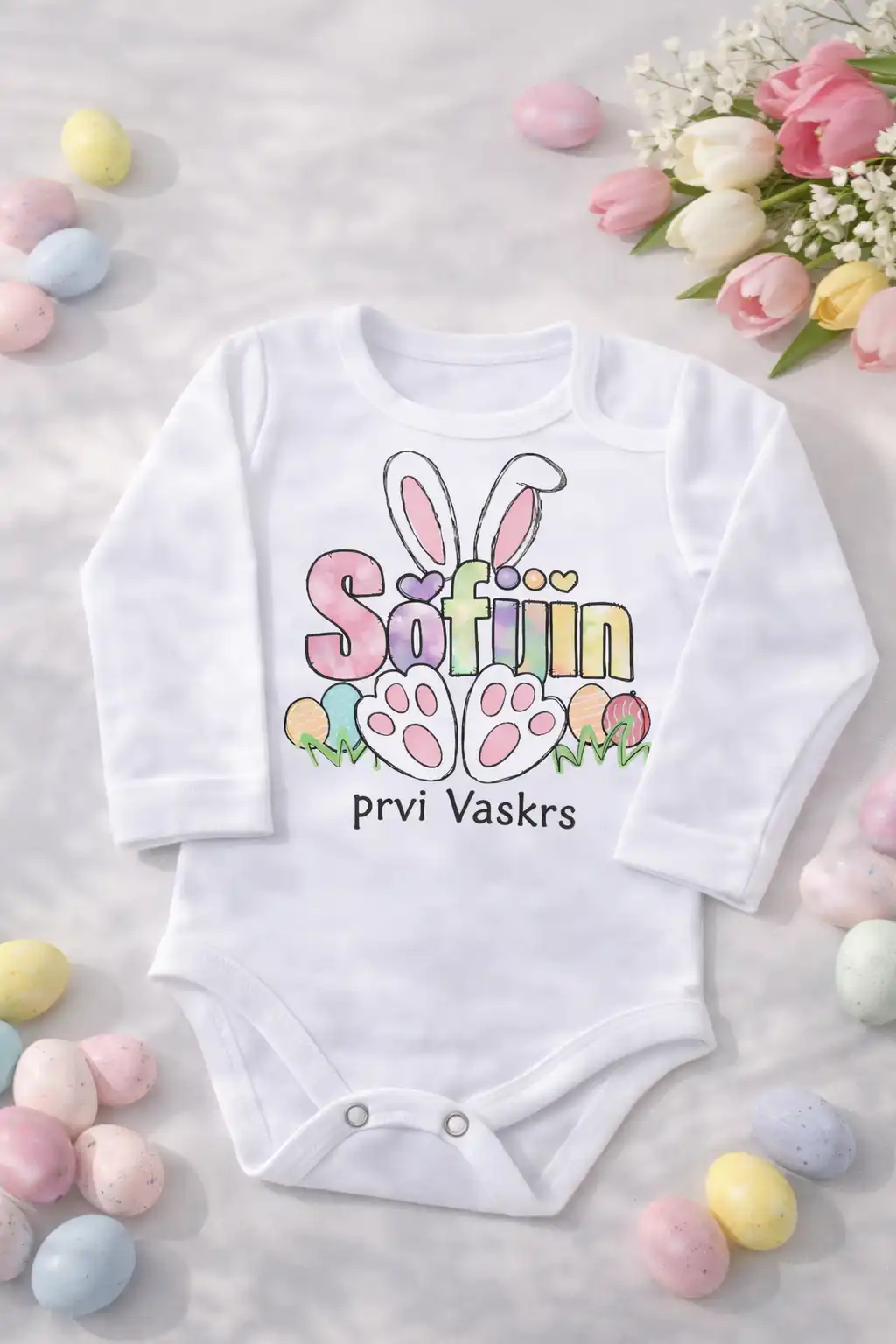 Pamucni bodic za bebe „Moj prvi Uskrs” napravljen je od mekanog, kvalitetnog pamuka koji je nezan prema osetljivoj bebinoj kozi. Idealan je za prve praznicne fotografije, proslave i uspomene. Bodi ima prakticno kopcanje izmedju nogica za lako presvlacenje i postojan print koji ostaje lep i nakon pranja. Savrsen izbor za prvi Uskrs vase bebe .