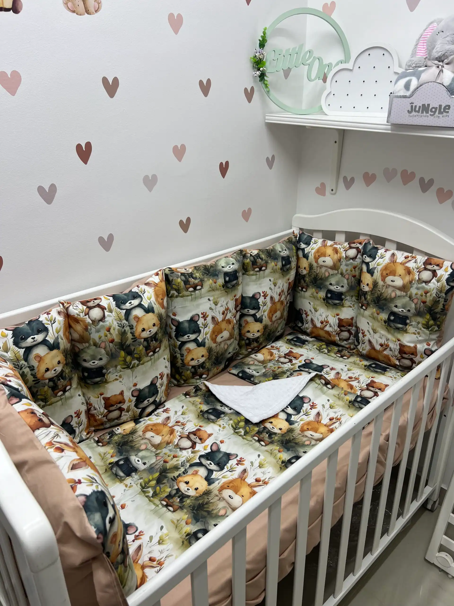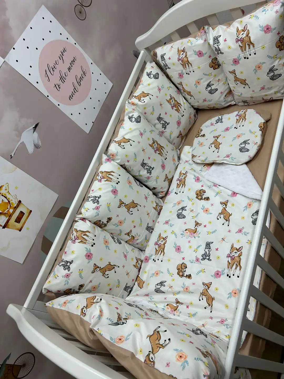 Posteljina i jastučići sastoje se od jastuka za tri strane kreveta, koji su opremljeni vezicama za pričvršćivanje i imaju navlake koje se mogu skinuti. Uz to, set uključuje dušečni čaršafom na lastišem, prekrivač i ravan jastuk.