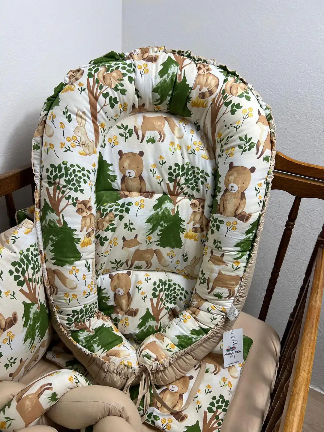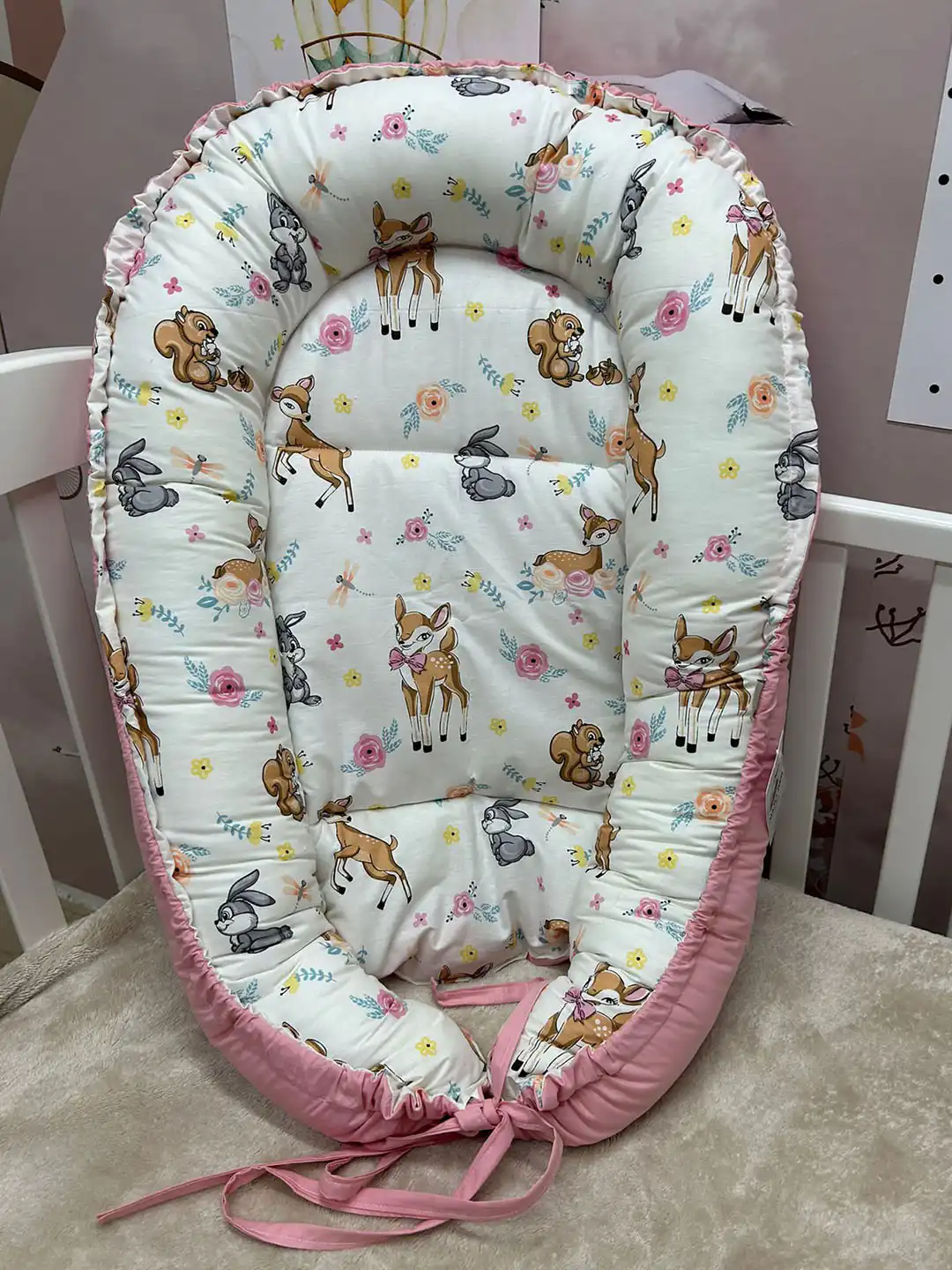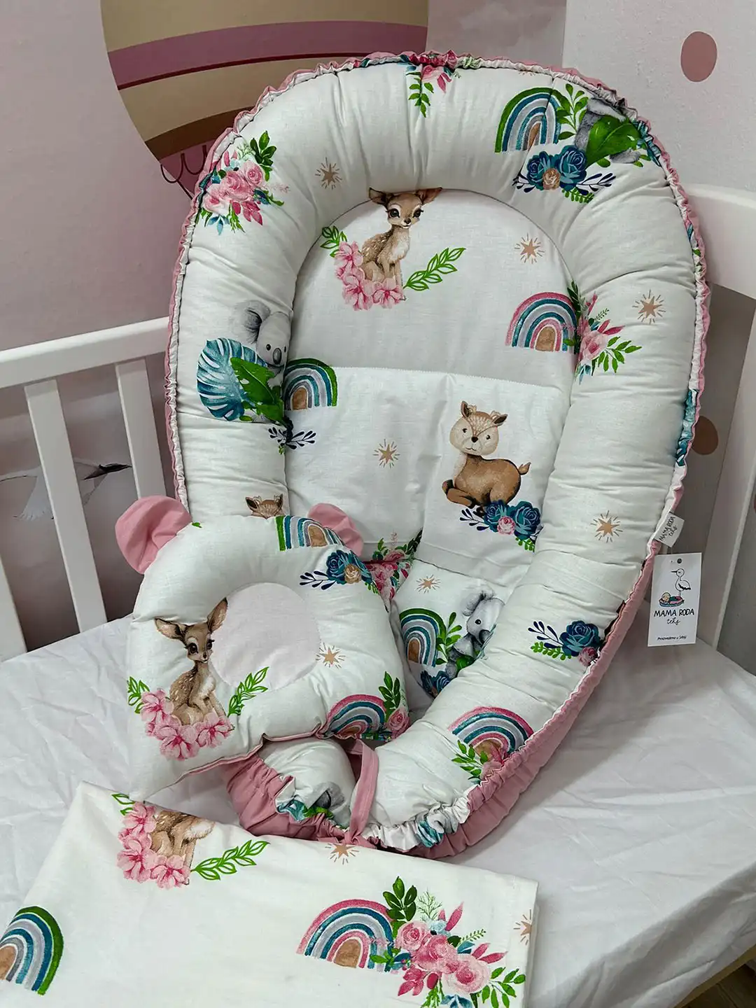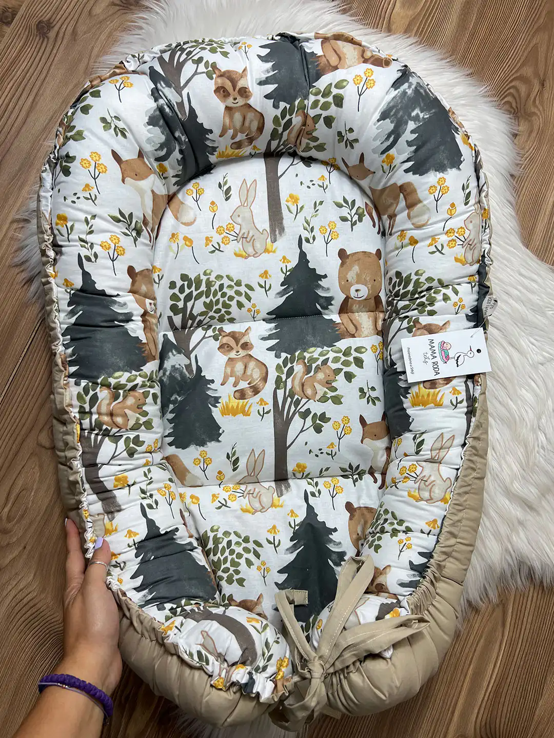 Gnezdo – prenosivi, sigurni i ušuškani kutak za vaše najmilije. Gnezdo na vezivanje ima dužinu ležišta oko 70 cm, ali malo gubi na dužini kada se veže. Predviđeno je da ga beba koristi do 6 meseci, nakon toga se odveže i nastavi da ga koristi tako odvezano.