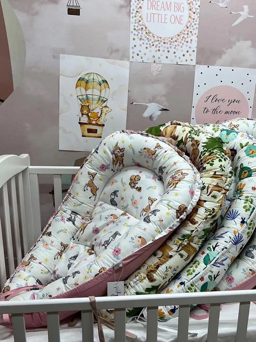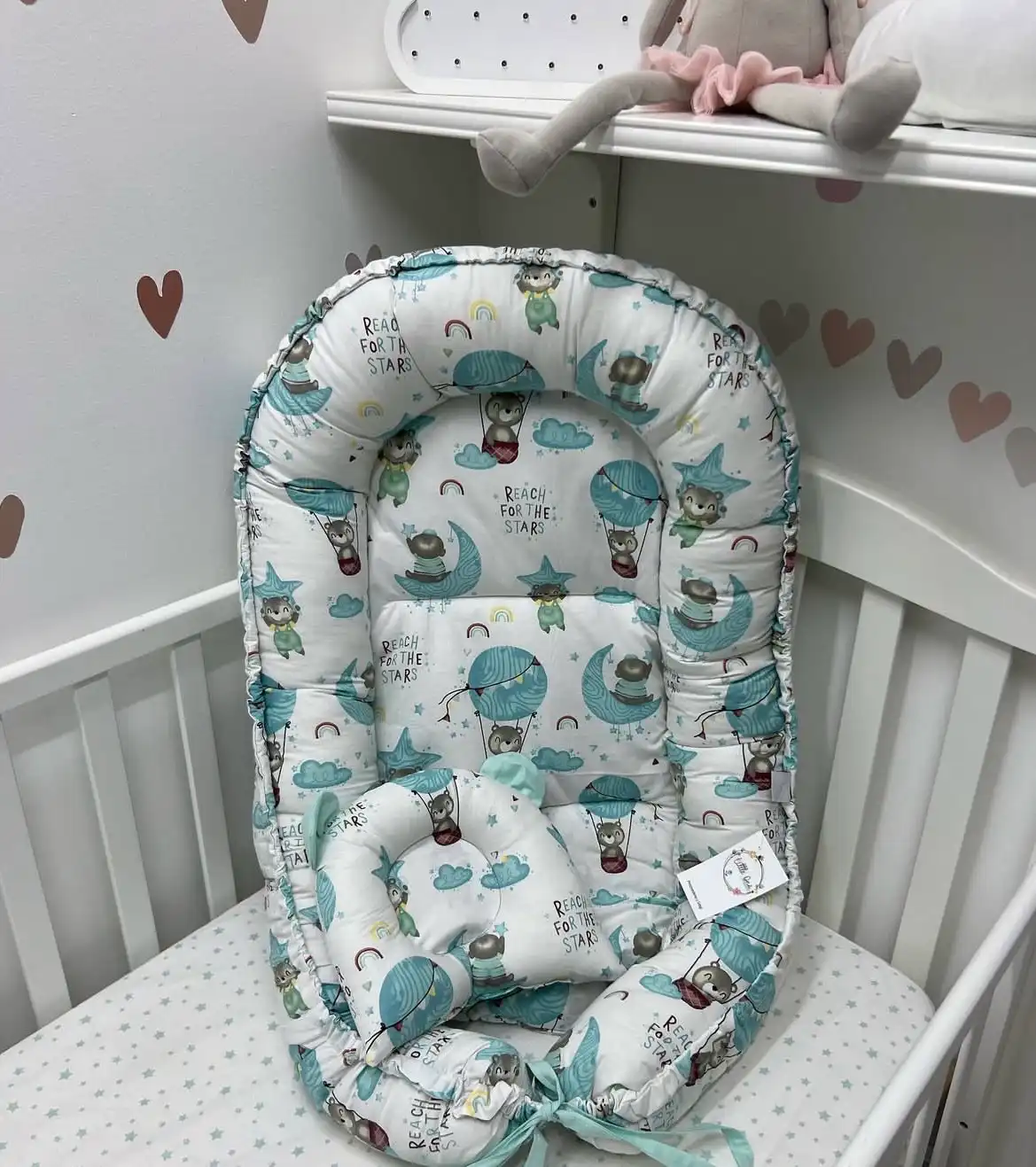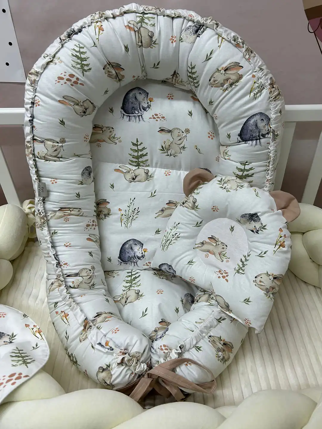 Gnezdo – prenosivi, sigurni i ušuškani kutak za vaše najmilije. Gnezdo na vezivanje ima dužinu ležišta oko 70 cm, ali malo gubi na dužini kada se veže. Predviđeno je da ga beba koristi do 6 meseci, nakon toga se odveže i nastavi da ga koristi tako odvezano.