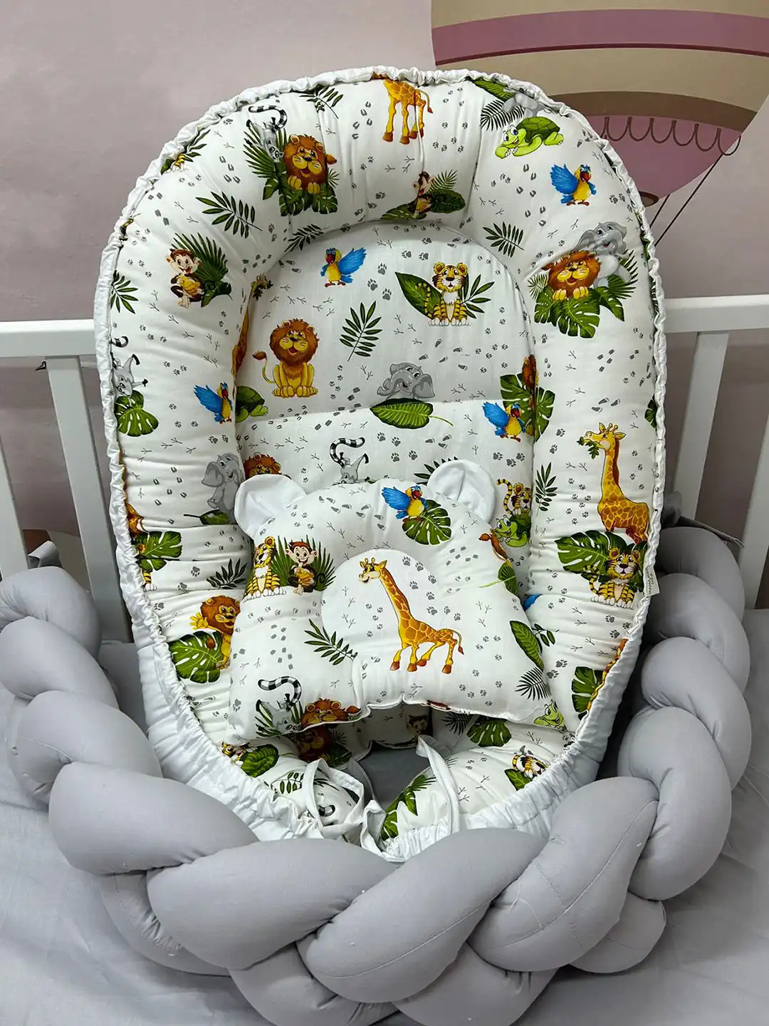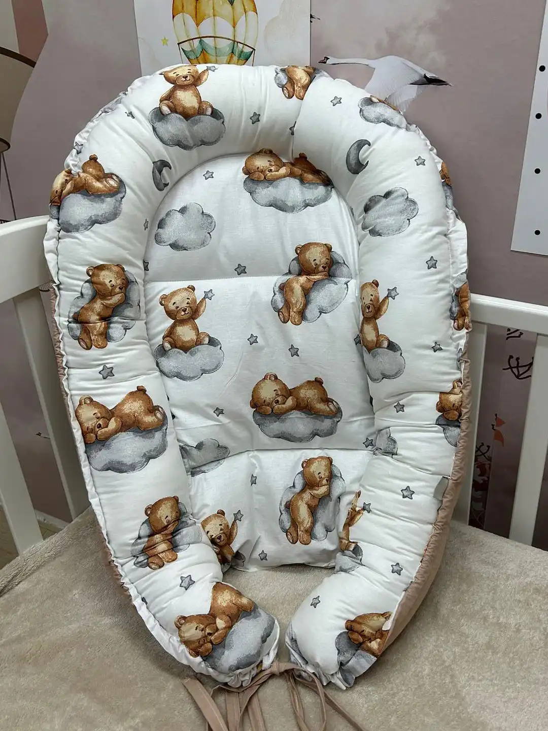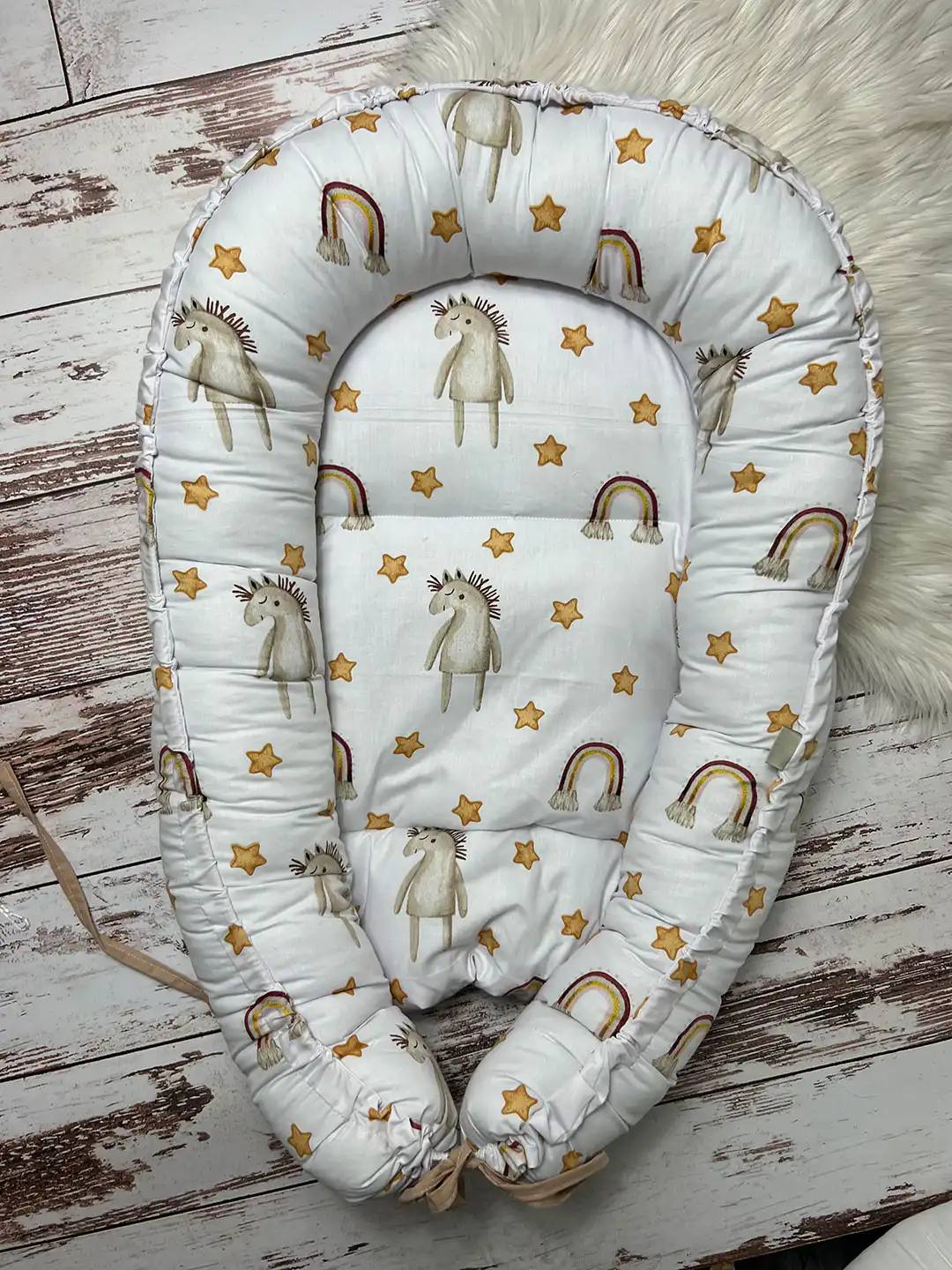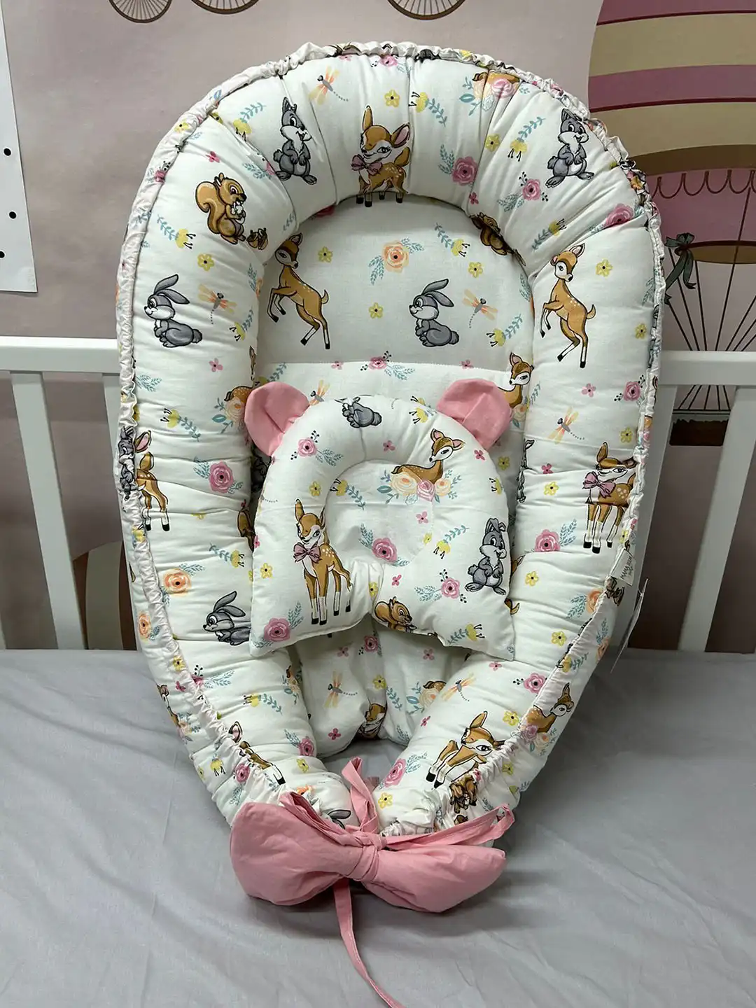 Gnezdo – prenosivi, sigurni i ušuškani kutak za vaše najmilije. Gnezdo na vezivanje ima dužinu ležišta oko 70 cm, ali malo gubi na dužini kada se veže. Predviđeno je da ga beba koristi do 6 meseci, nakon toga se odveže i nastavi da ga koristi tako odvezano.