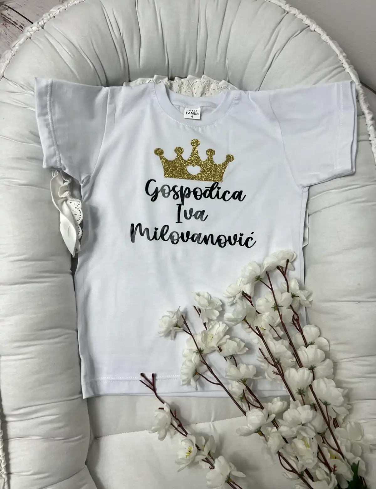Naša personalizovana majica za devojčice dolazi sa natpisom „Gospođica [Prezime]“ – jer ona je mala dama sa stavom! 💖