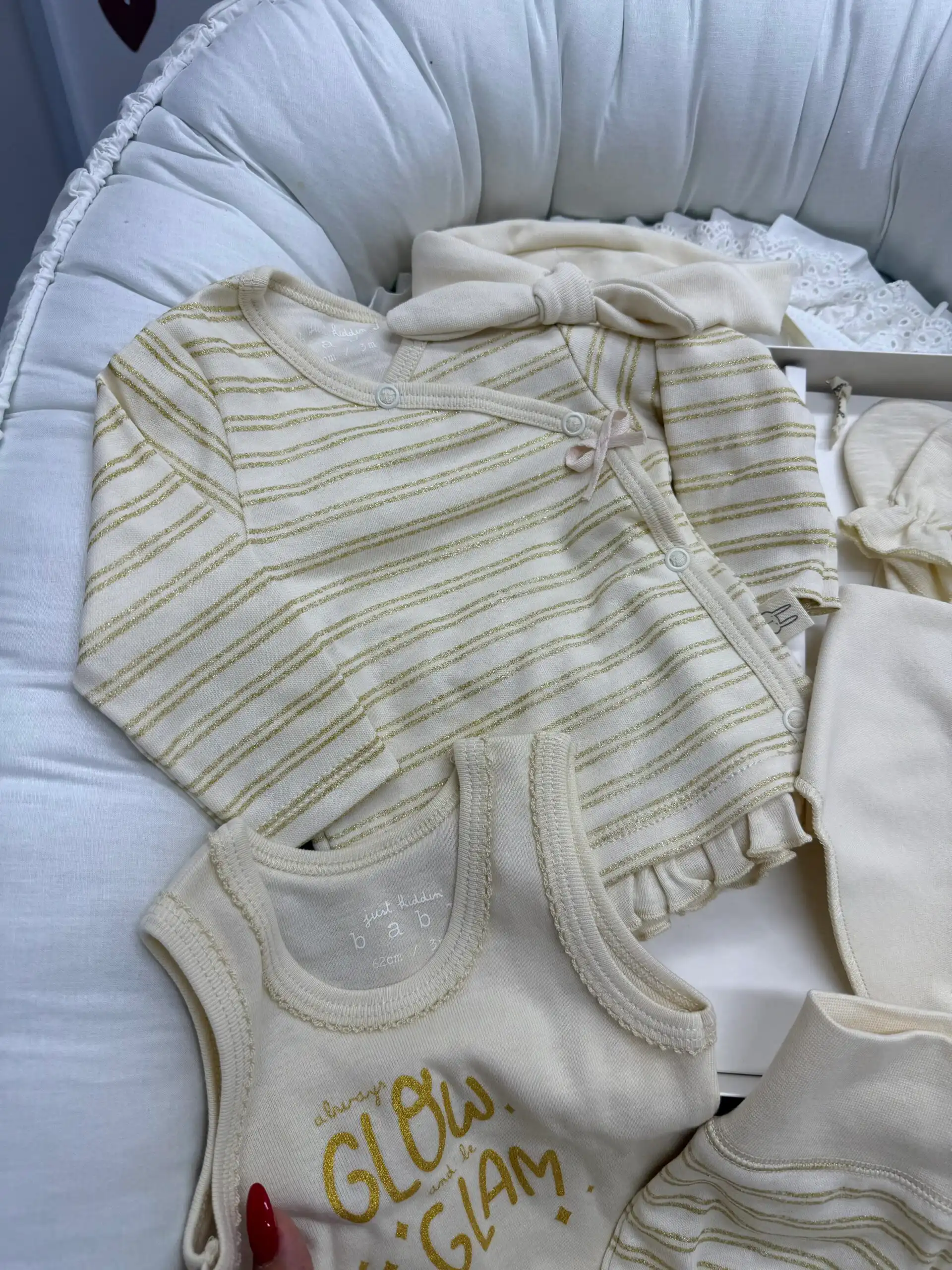 Just Kiddin 6/1 set pažljivo je osmišljen kako bi obezbedio potpunu udobnost i praktičnost od prvih bebinih dana 🌿 Izrađen je od visokokvalitetnog pamuka, mekanog i nežnog prema osetljivoj bebinoj koži, idealnog za celodnevno nošenje i miran san 😴