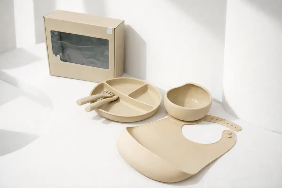Set posuđa je napravljen od bezbednog silikona za hranu 🍴, bez mirisa, BPA i PVC materijala. Mekani kvalitetni silikon je nežan prema bebinim ustima i zubićima, pa nema straha od povreda pri hranjenju 👶.