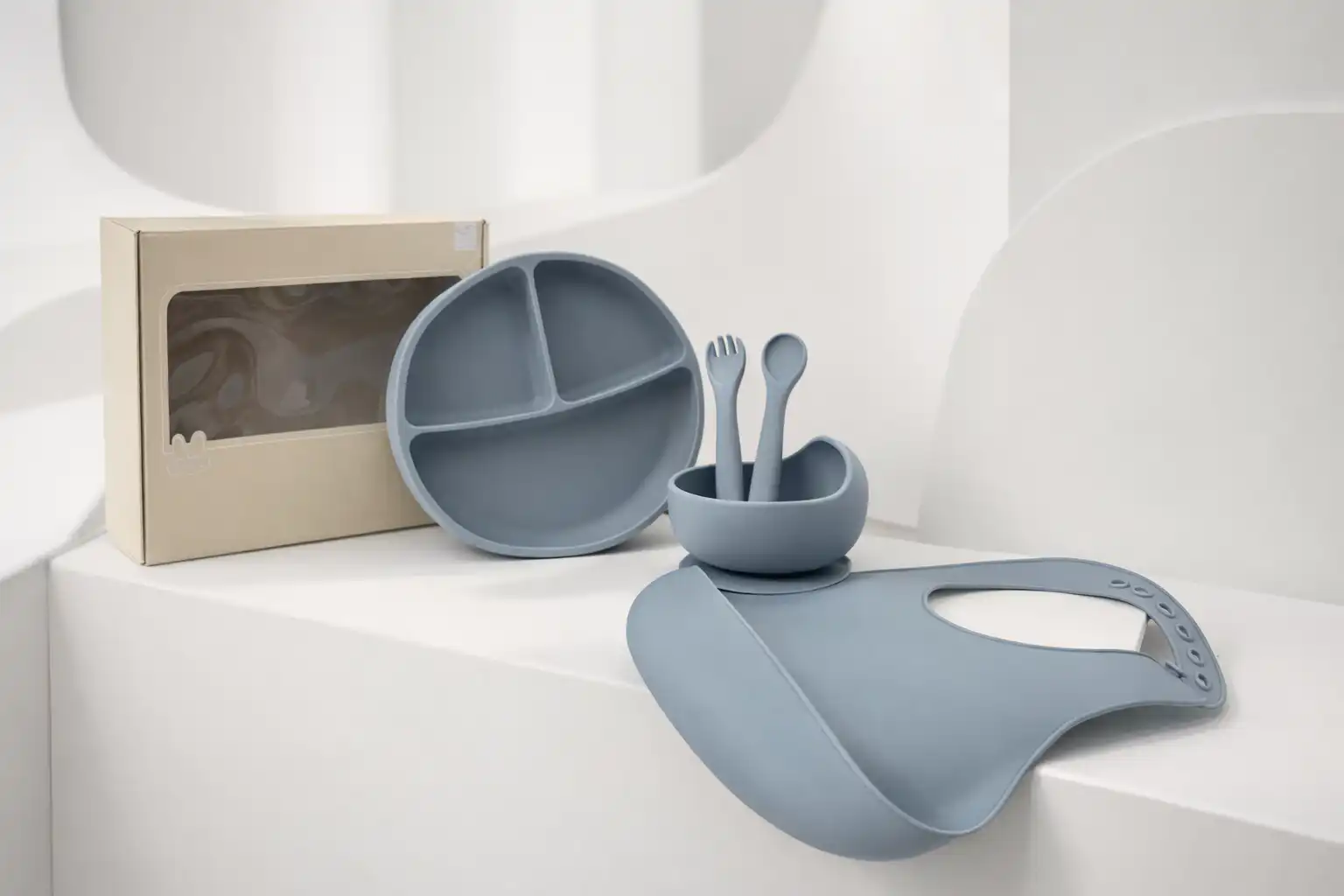 Set posuđa je napravljen od bezbednog silikona za hranu 🍴, bez mirisa, BPA i PVC materijala. Mekani kvalitetni silikon je nežan prema bebinim ustima i zubićima, pa nema straha od povreda pri hranjenju 👶.