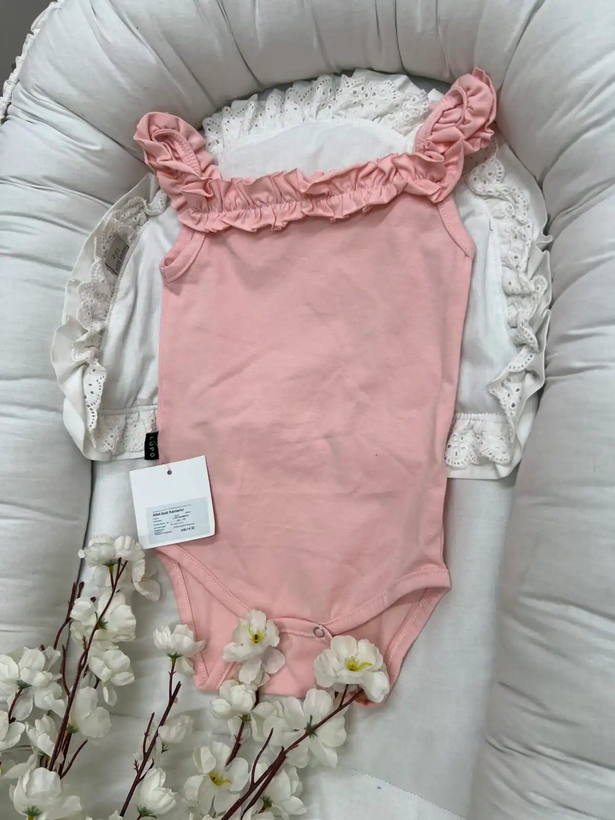 Pamučni bodić na tanke bretele izrađen od mekanog i prijatnog materijala koji je nežan prema bebinoj koži. Idealan za tople dane i svakodnevno nošenje. 👶