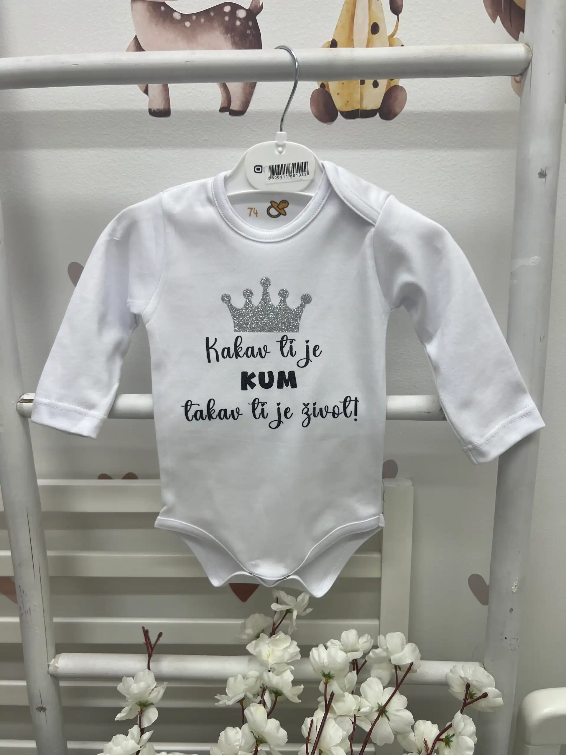 Ovaj bodić je savršen za sve mališane koji žele da pokažu koliko je njihov kum poseban. Sa zabavnim i mudrim natpisom „Kakav ti je kum, takav ti je život“, ovaj bodić donosi dozu humora i ljubavi. Idealno za poklon, rođendane ili bilo koji poseban trenutak, ovaj bodić će sigurno nasmejati sve oko vas!
