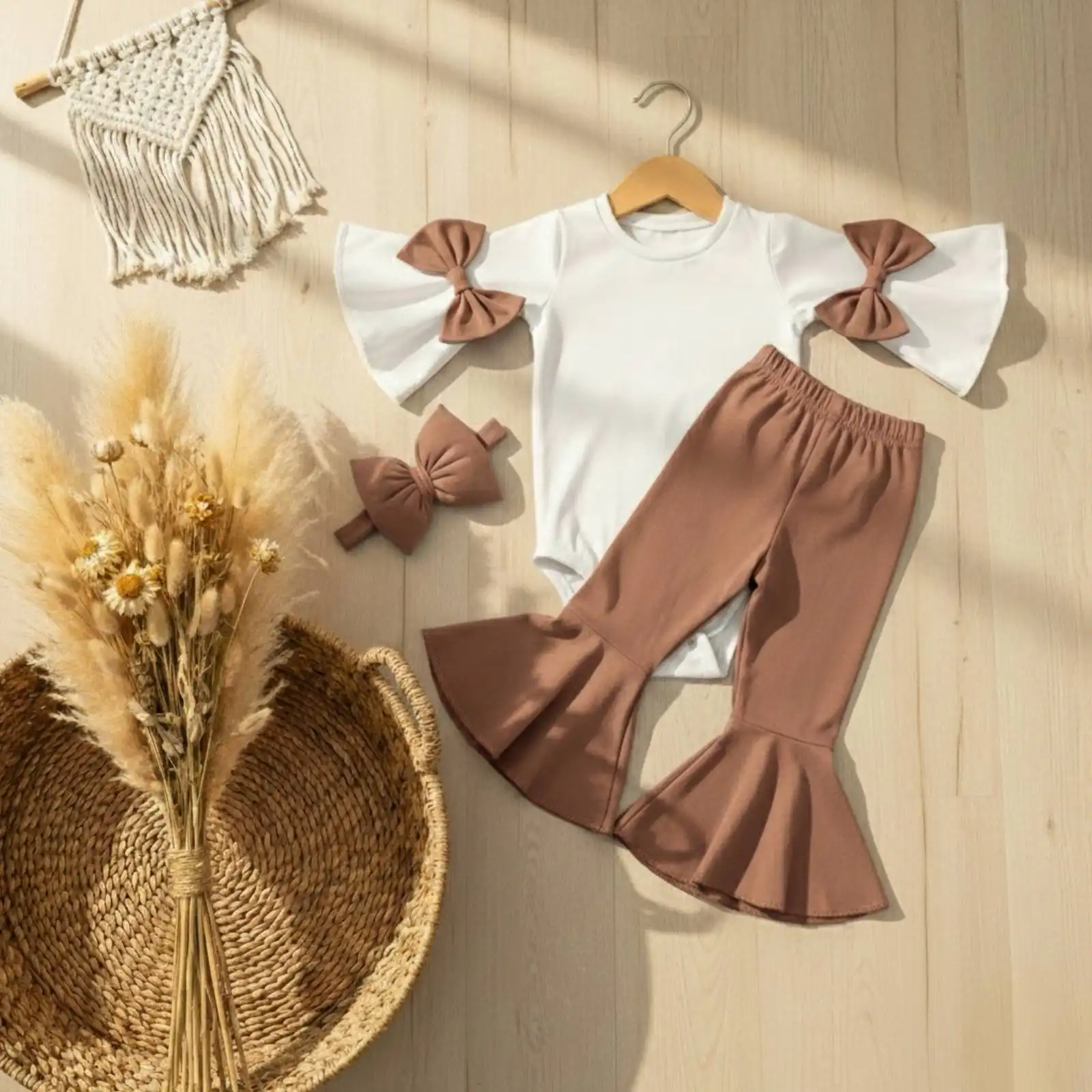 Elegantan i nežan komplet za bebe i devojčice 👶✨ Ovaj unikatni set sastoji se od bodića sa efektnim zvonastim rukavima i dekorativnim mašnama, modernih zvonastih helanki i usklađene trakice za kosu. Dizajniran je da spoji udobnost i stil, pa je idealan izbor za rođendane, fotografisanja, proslave i sve posebne prilike 📸
