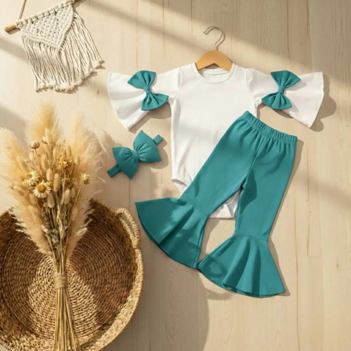 Elegantan i nežan komplet za bebe i devojčice 👶✨ Ovaj unikatni set sastoji se od bodića sa efektnim zvonastim rukavima i dekorativnim mašnama, modernih zvonastih helanki i usklađene trakice za kosu. Dizajniran je da spoji udobnost i stil, pa je idealan izbor za rođendane, fotografisanja, proslave i sve posebne prilike 📸