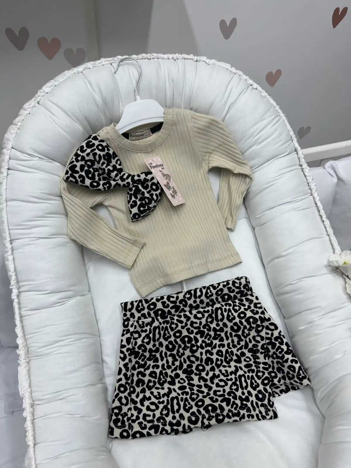 Set se sastoji od bluze od rebrastog pamuka sa dekorativnom mašnom i uklopljenog šortsa ili suknjice, savršen za nežan i moderan dečiji stil 🌸