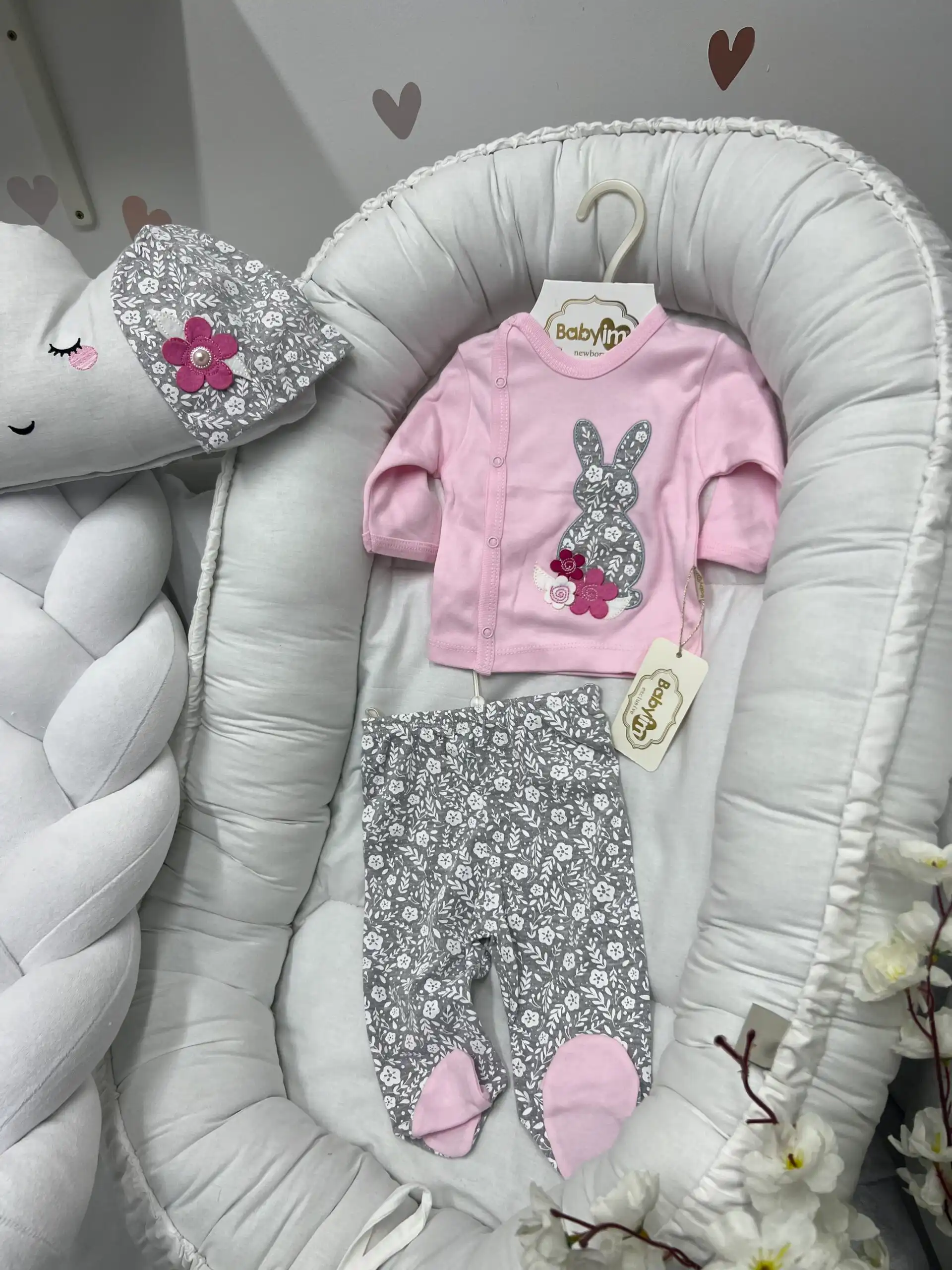 Jako poseban komplet za novorođenče, napravljen od 100% pamuka, u prelepoj kombinaciji nežno roze i sive boje savršen je za izlazak iz porodilišta i prve dane vaše bebe 👶✨. Izuzetno je mekan i udoban, pružajući vašem mališanu maksimalnu toplinu i udobnost.