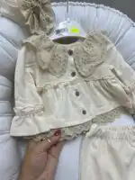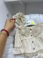 Trodelni set za tek rođenu princezu u prelepoj, nežnoj bež boji je savršen izbor za prve dane vaše bebe 👶💖. Napravljen od 100% pamuka, ovaj set je izuzetno mekan i nežan prema bebinoj koži, pružajući maksimalnu udobnost. Set je ukrašen pamučnom čipkom koja dodaje dašak elegancije i posebnosti svakom komadu. Bež boja je svestrana i sofisticirana, idealna za stvaranje nežnih, ali prelepih odevnih kombinacija.