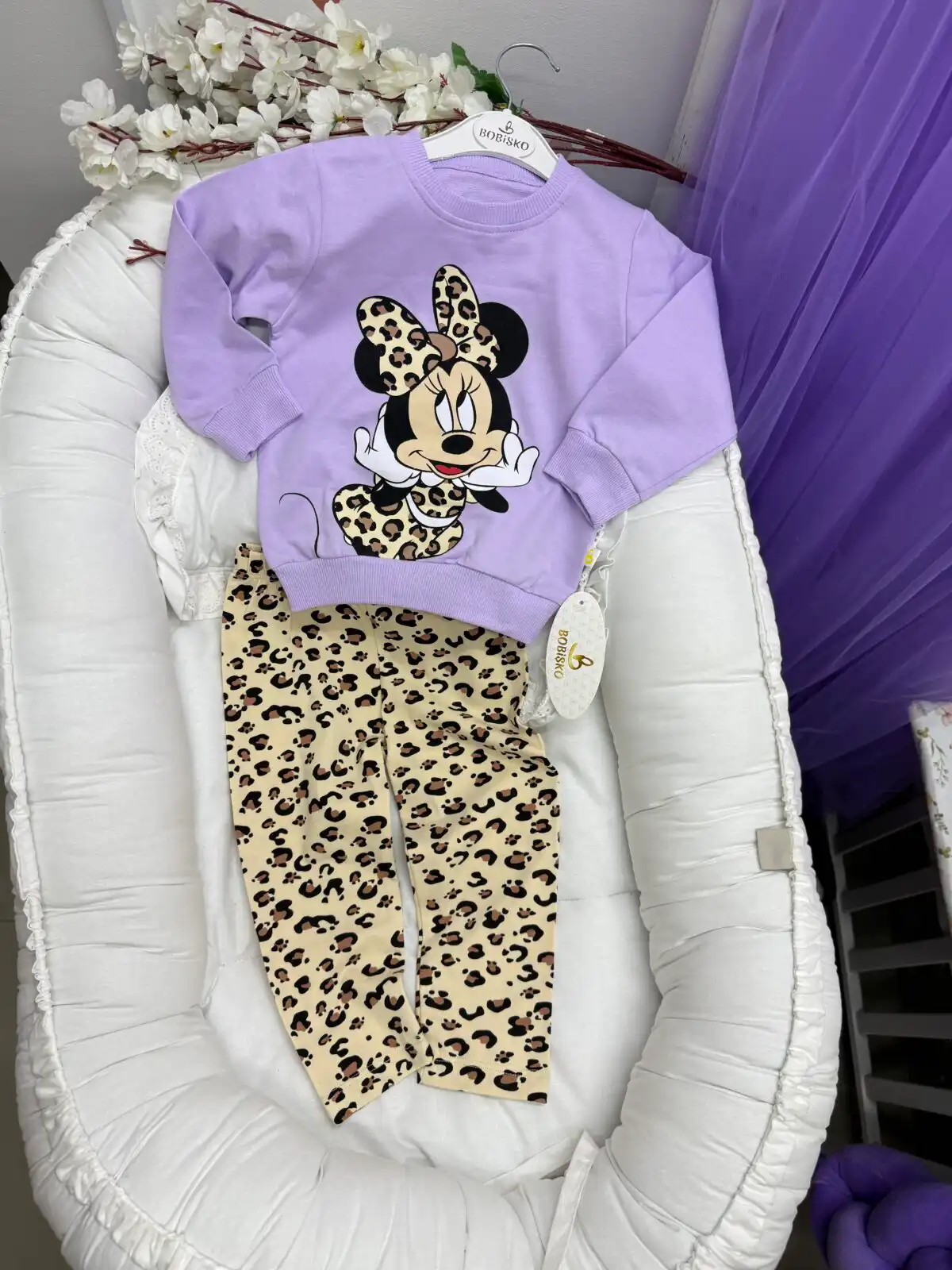Set se sastoji od duksica u nežnoj lila boji sa motivom Minnie Mouse i tifrastih helanki, savršen spoj udobnosti i razigranog stila 🎀✨