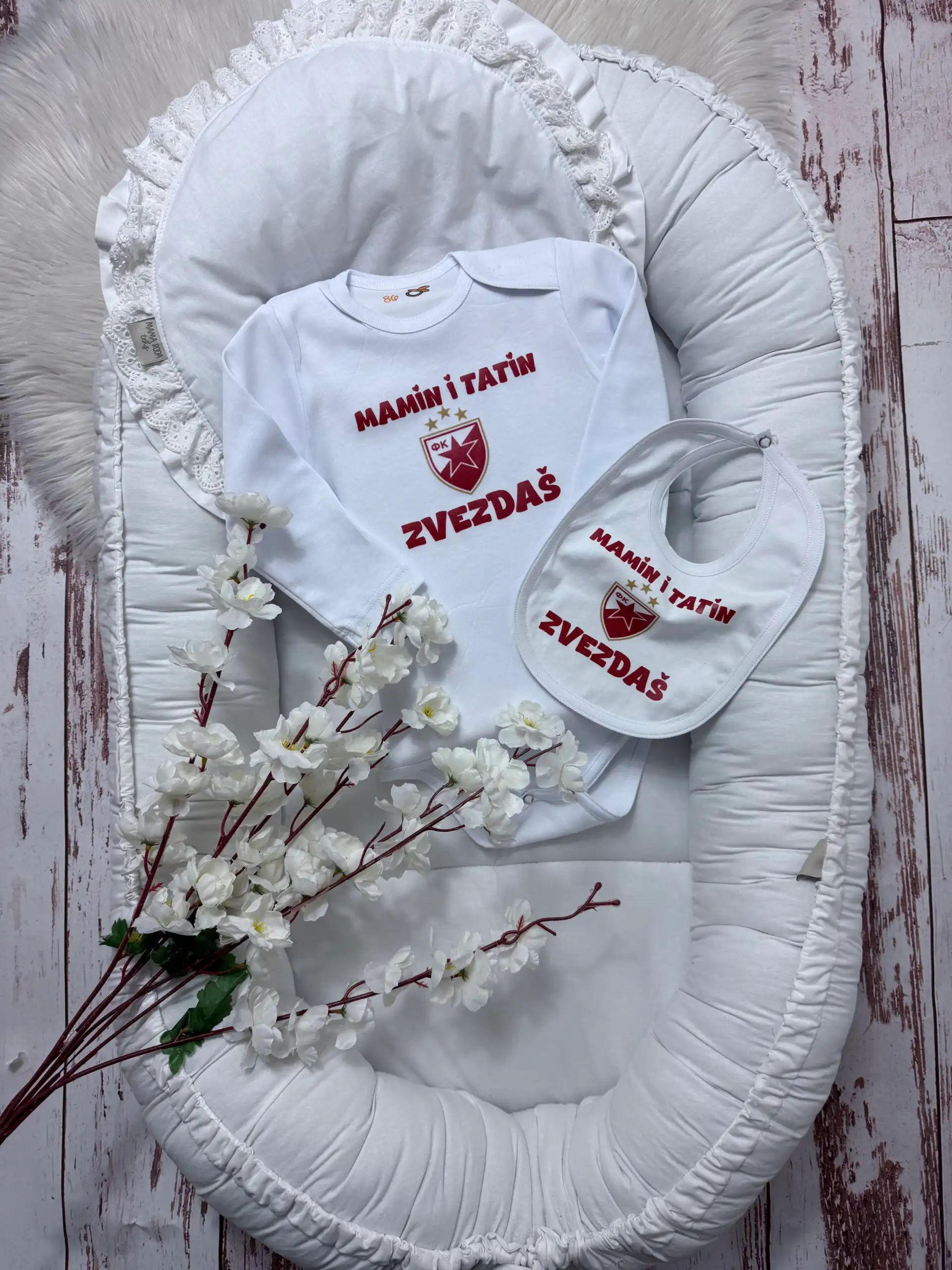 Za najmlađe ljubitelje fudbala – bodić sa natpisom „Mamin i tatin zvezda“ i motivom FK Crvena Zvezda! Idealno za mališane koji već od rođenja pokazuju ljubav prema svom omiljenom klubu.
