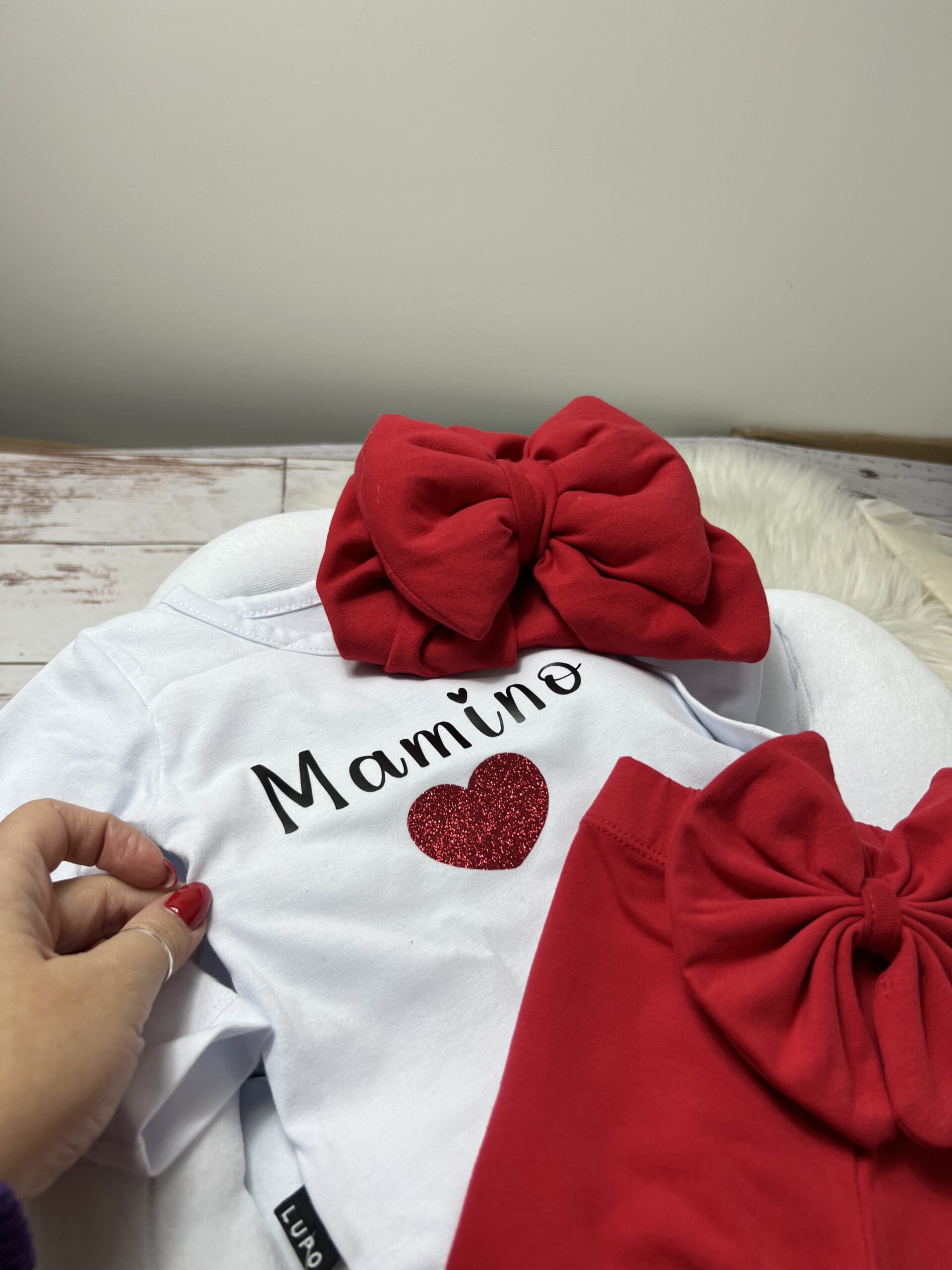✨ Kompletić „Mamino“ sa Gliter Srcem i Crvenim Detaljima ✨