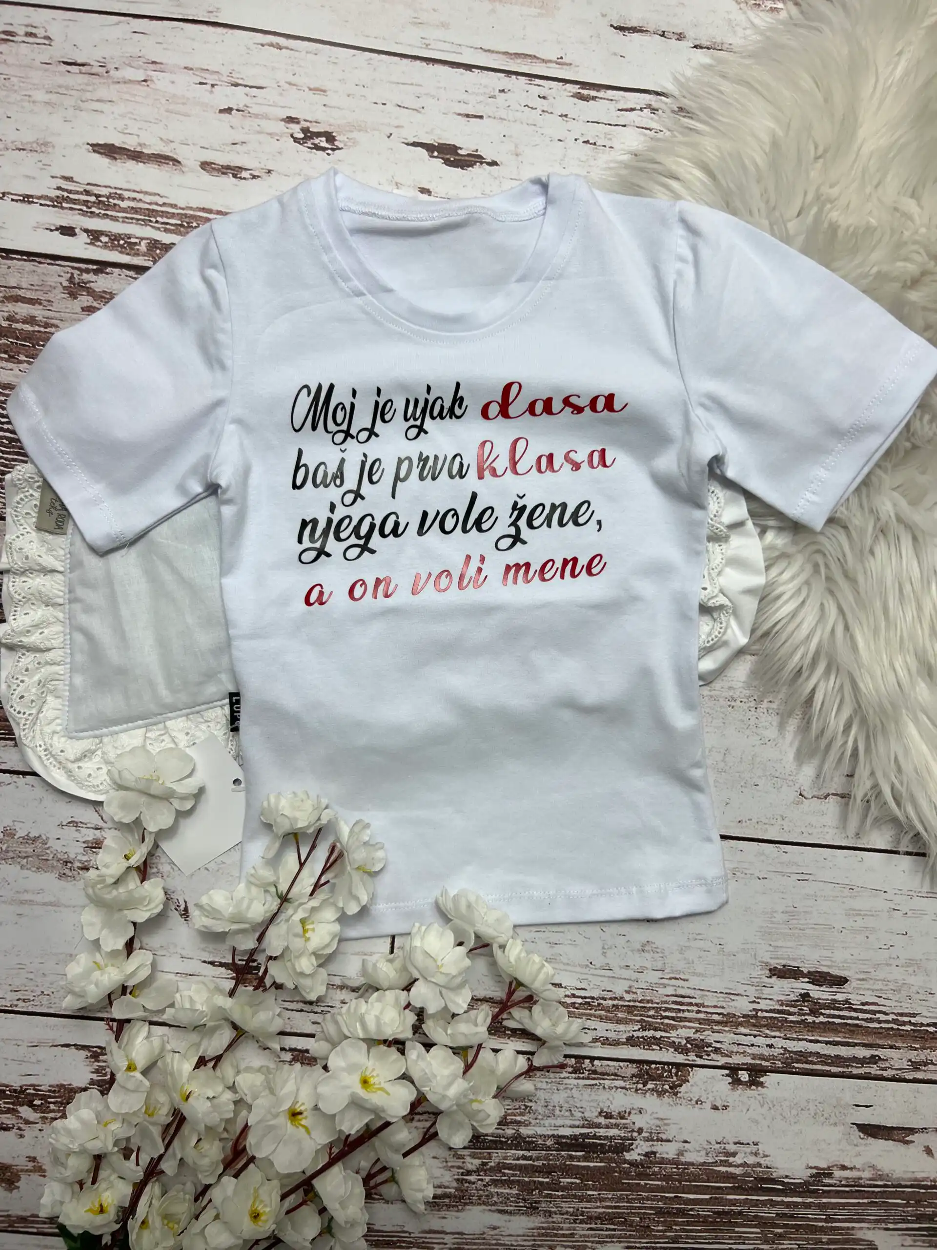 Ova vesela i simpatična majica je savršen poklon za decu koja imaju ujaka, a posebno za one čiji je ujak pravi daša! Sa modernim i šarenim dizajnom, majica nosi natpis ‘Moj ujak je daša’, pokazujući koliko je ujak poseban u njihovim životima. Napravljena od kvalitetnog pamuka, udobna je za nošenje tokom celog dana, bilo da se igraju ili provode vreme sa svojim omiljenim ujkom.