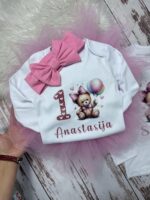 Proslavite prvi rođendan vaše princeze sa predivnim setom: bodić sa natpisom „Moj prvi rođendan“, imenom deteta, slatkim medom, uz roze tutu suknjicu i trakicu za kosu!
