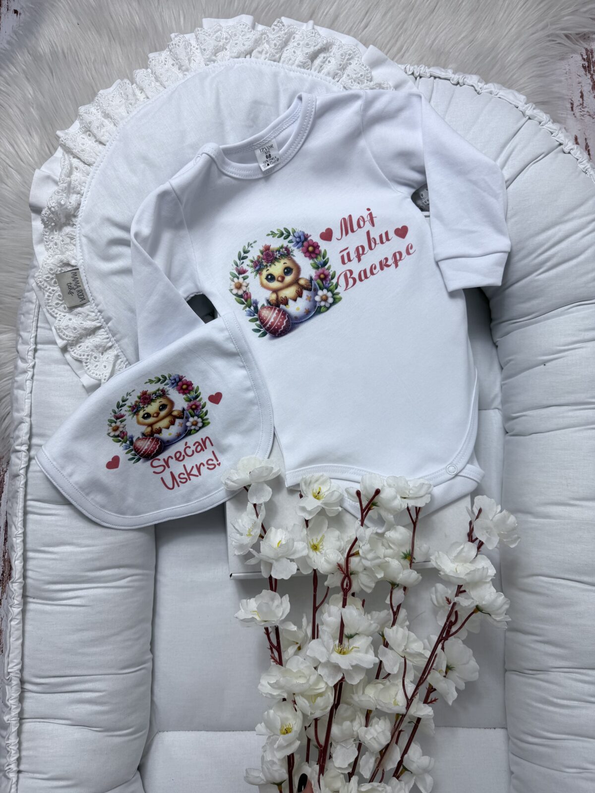 Za vašu malu princezu, bodić sa preslatkim piletom i natpisom „Moj prvi Vaskrs“! Neka ovaj poseban trenutak bude obeležen ljubavlju i udobnošću.