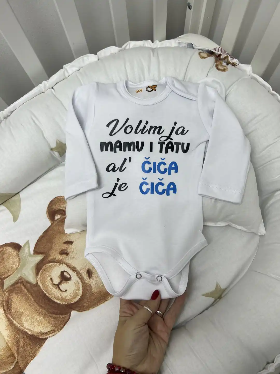 Dodajte dašak humora i ljubavi sa našim posebnih bodićem za bebu! Natpis „Volim mamu i tatu, al čiča je čiča” savršen je izbor za mališane koji vole da se igraju sa rečima i nasmeju svoju porodicu. Ovaj slatki bodić nije samo udoban i nežan prema bebinoj koži, već je i zabavan način da pokažete posebnu ljubav prema svim članovima porodice, uključujući i omiljenog čiču!