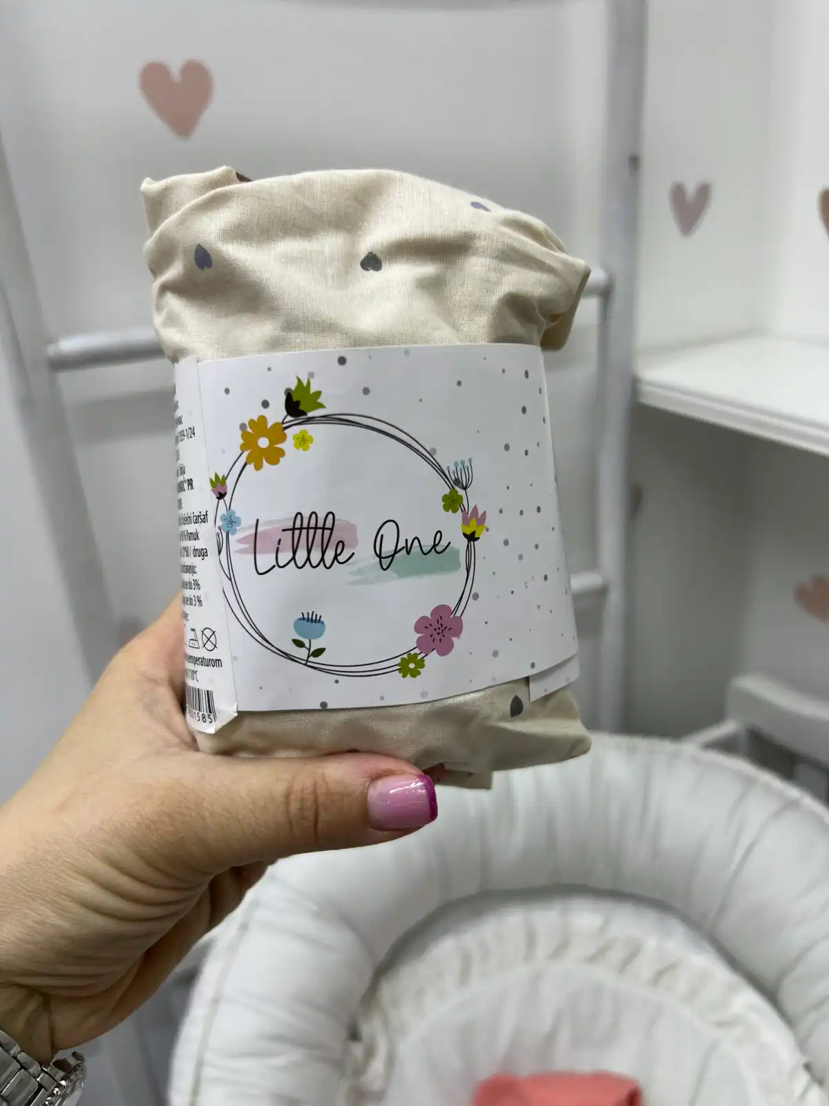 Navlaka u dezenu za jastuče u kolicima / deo kao kolevka – srculenca na bež pozadini