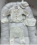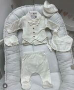 Komplet ukljuÄuje sve Å”to je potrebno: bodi, pantalone, kapicu, portiklu i Äarapice ā sve u prefinjenoj beloj boji koja simbolizuje ÄistoÄu i nežnost.