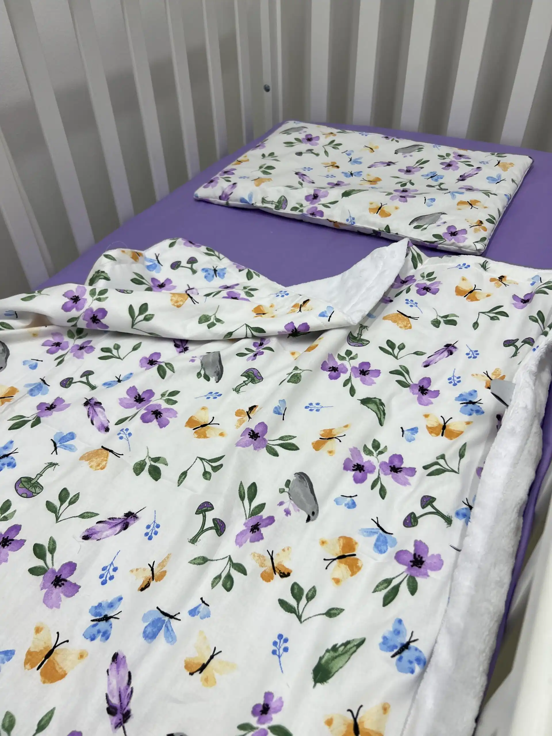 Veseli i udobni set za krevetac – dušečni čaršaf sa lastišem, ravno jastuče i prekrivač u šarenim bojama za prve snove pune nežnosti.
