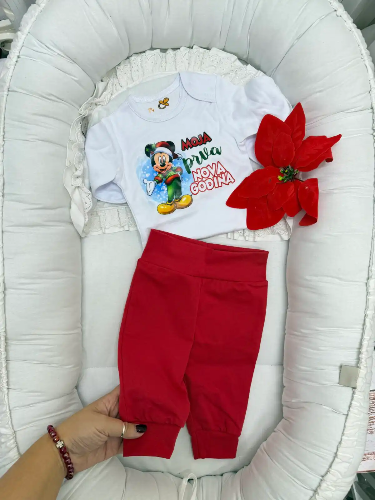 Novogodišnji bodić od mekanog pamuka, udoban i nežan za bebinu kožu i uz to donji deo u crvenoj boji Savršen spoj za praznične fotke i prve novogodišnje uspomene. 🎄✨