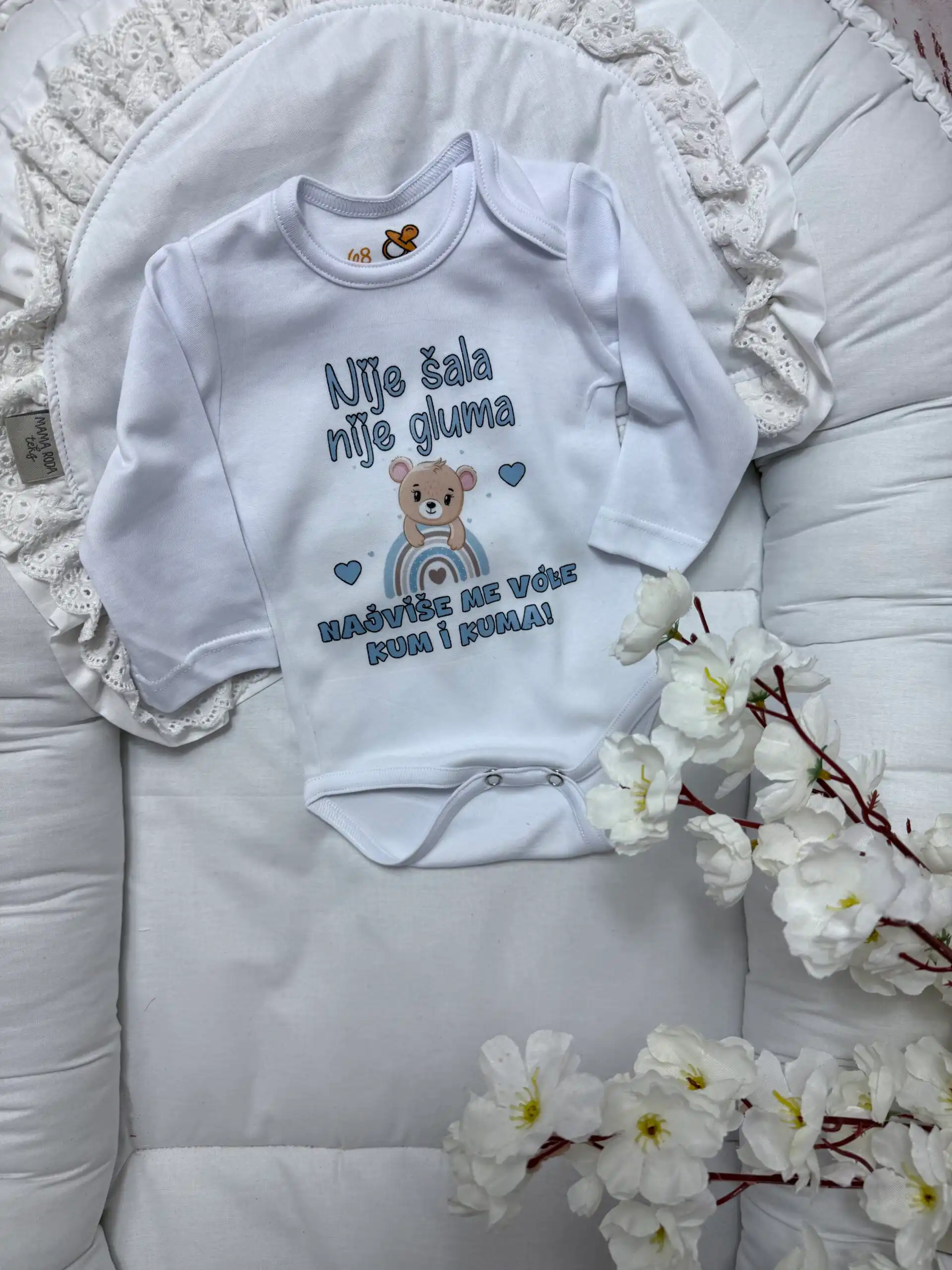 Predstavljamo bodić za dečake sa preslatkim natpisom „Nije šala, nije gluma, najviše me vole kum i kuma“ – savršen poklon za male mezimce i njihove najdraže kumove!