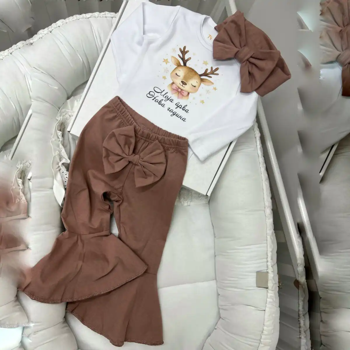 Praznični komplet od tri dela – bodić sa novogodišnjim motivom, mekane pamučne zvonarice i trakica. Udobno, nežno i idealno za praznično slikanje. 🎄✨