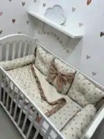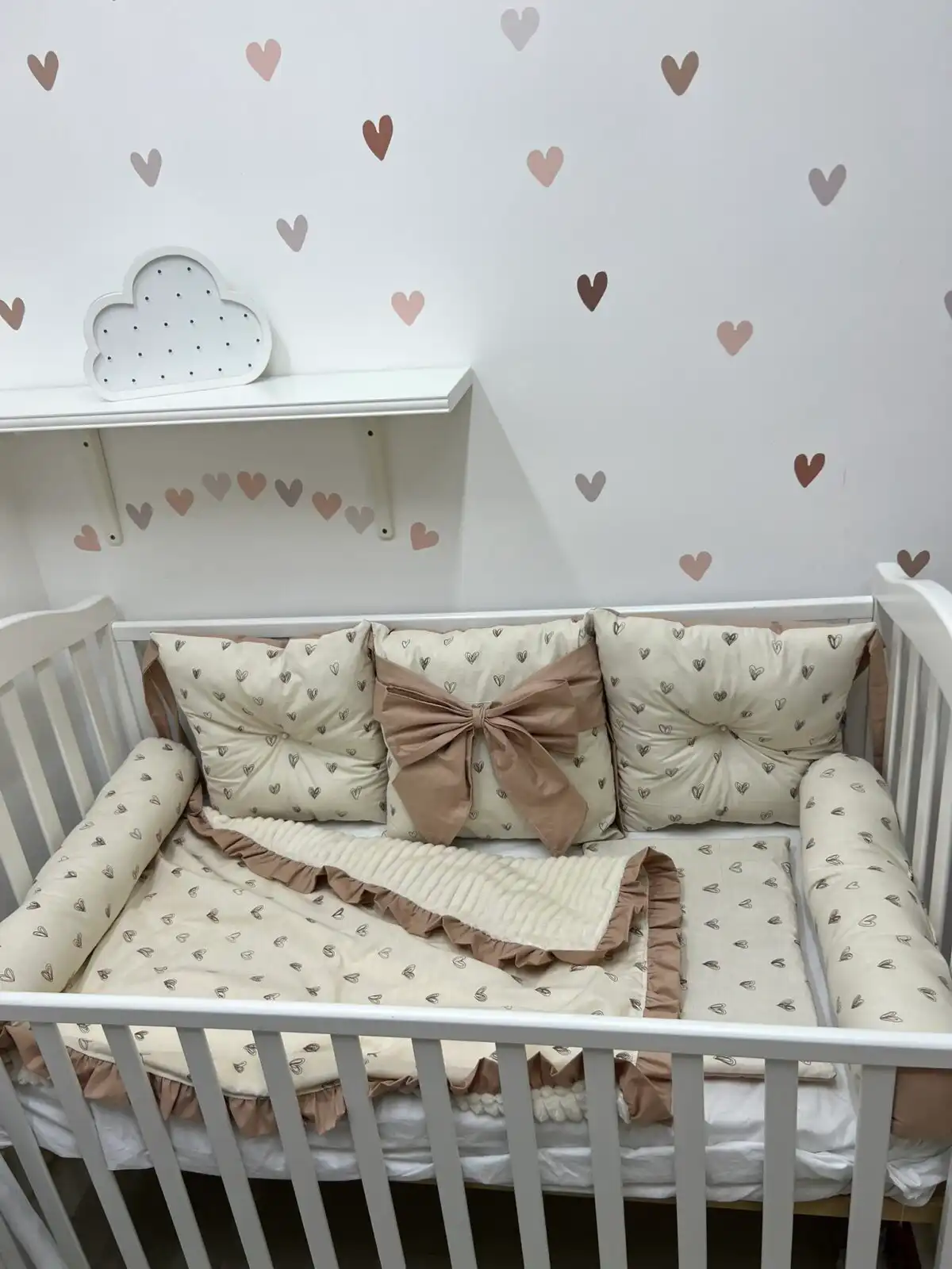Set posteljine za krevetac u nežnoj bez kombinaciji sa motivima srculenca — elegantan, romantičan i savršen za prve bebine dane 💗