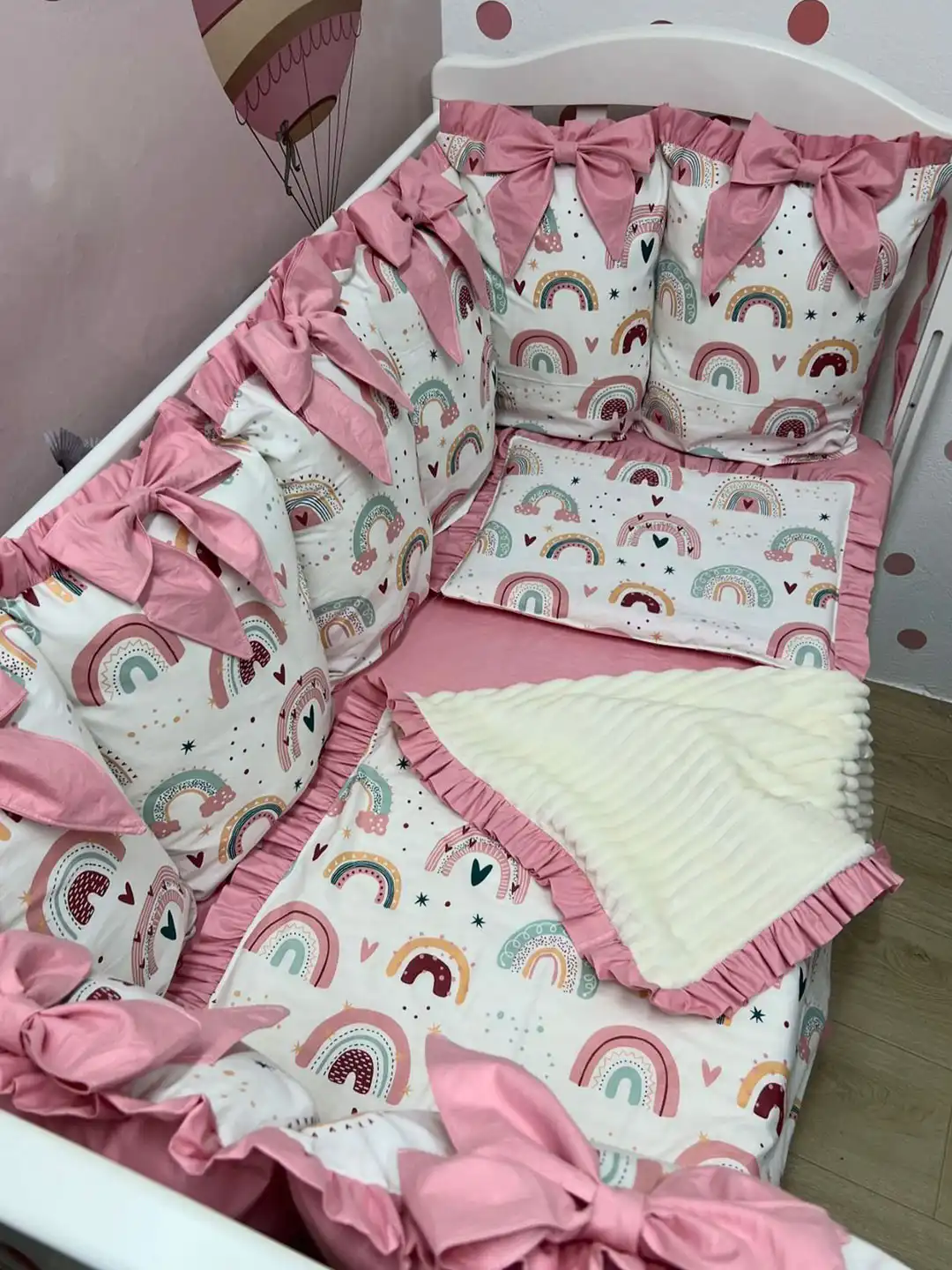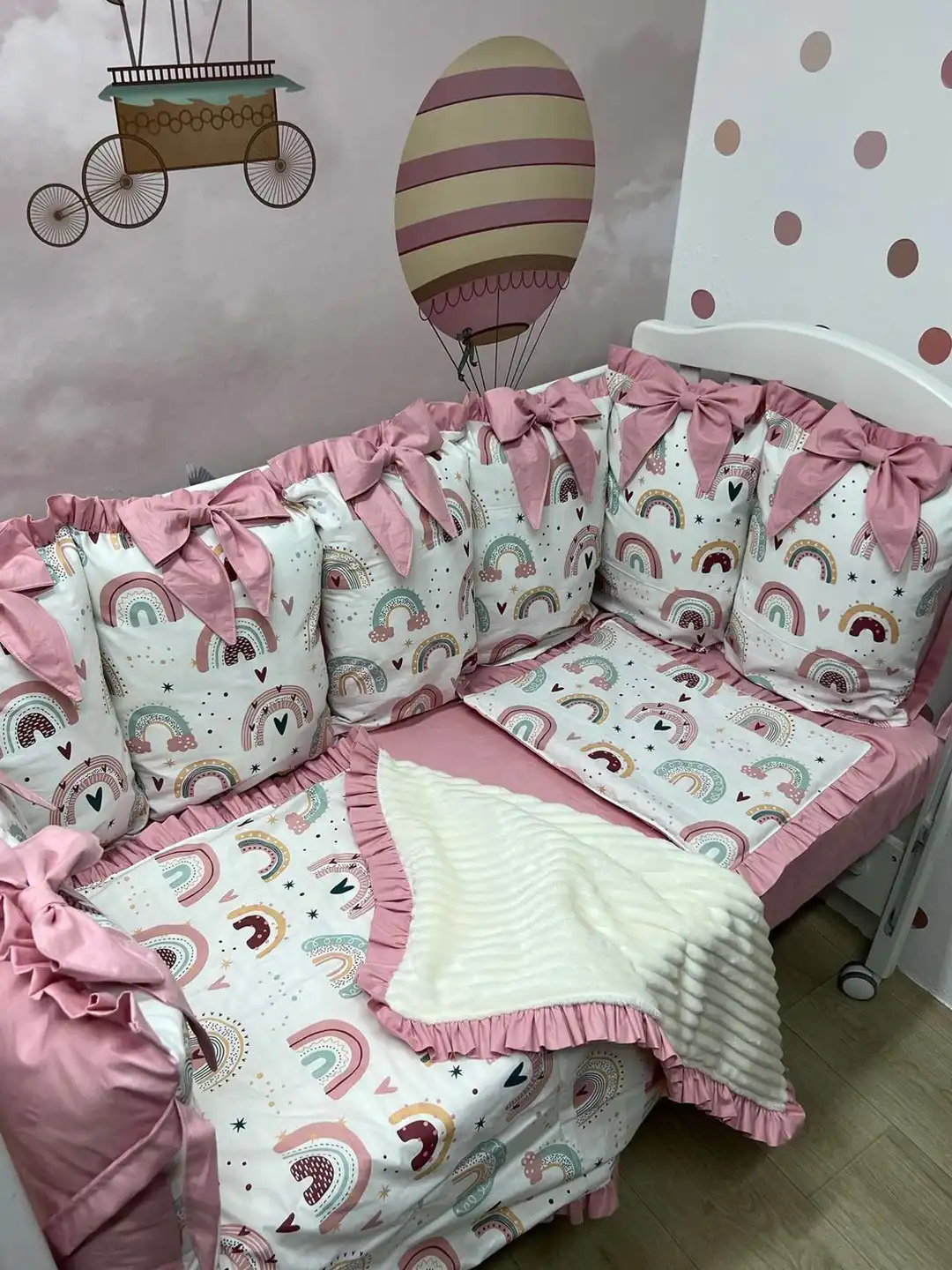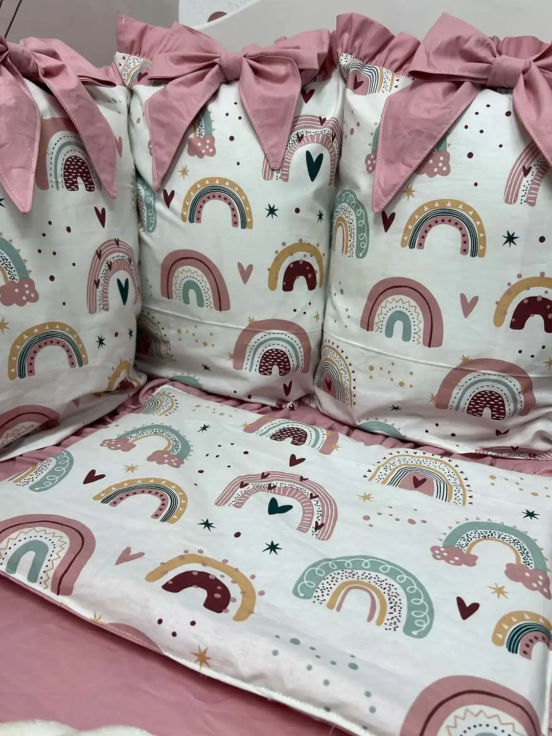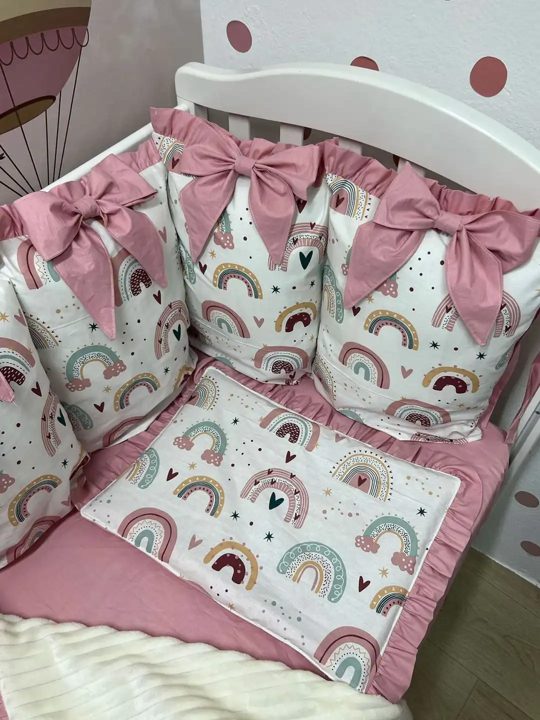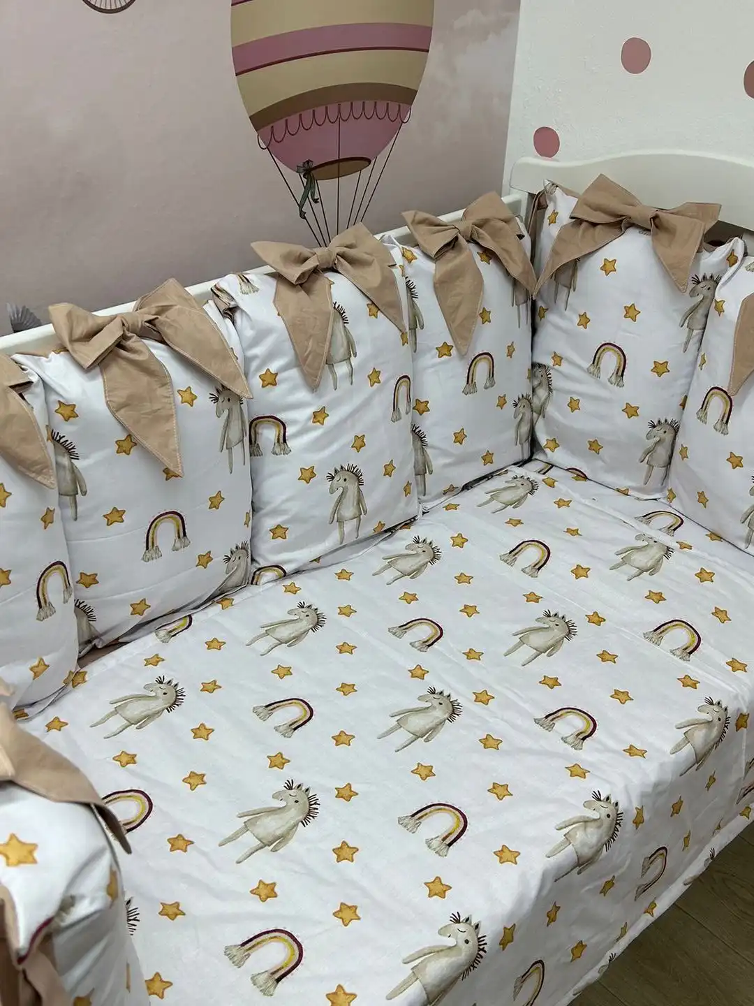 Set posteljine sadrži jastuke za tri strane kreveca, sa vezicama koje omogućavaju lako vezivanje za krevetac, a svi jastuci imaju navlake koje se skidaju. Tu su i dušek sa čaršafom na lastiš, prekrivač i ravni jastuk. 🛏️✨