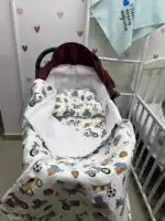 Sadrži navlaku za jastuče (pamučnu ili nepromočivu), anatomsko „meda“ jastuče za glavu i lagani prekrivač – sve u usklađenim dezenima. Idealno za prve šetnje vaše bebe.