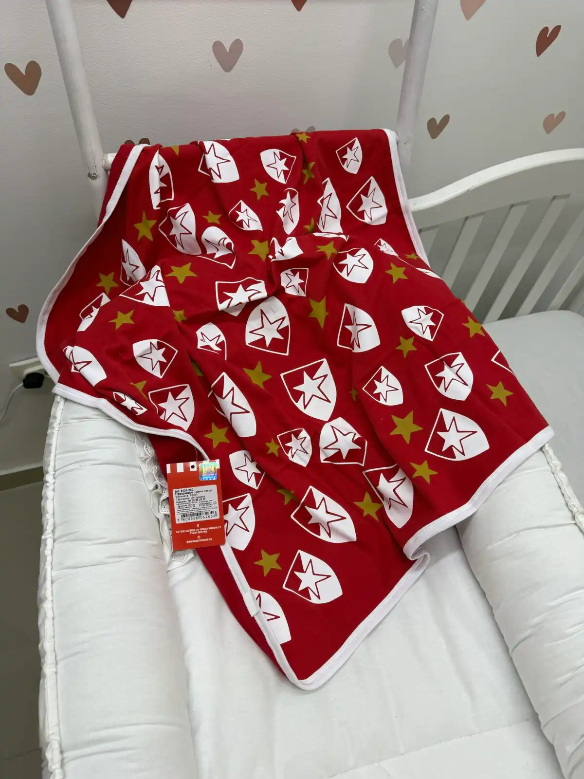 Pamučni dvostrani prekrivač za bebe i decu sa motivom Crvene zvede ❤️ izrađen od 100% interlok pamuka. Mekan, prijatan i praktičan za svakodnevnu upotrebu u krevecu, kolicima ili tokom odmora. Dimenzije 80×90 cm.