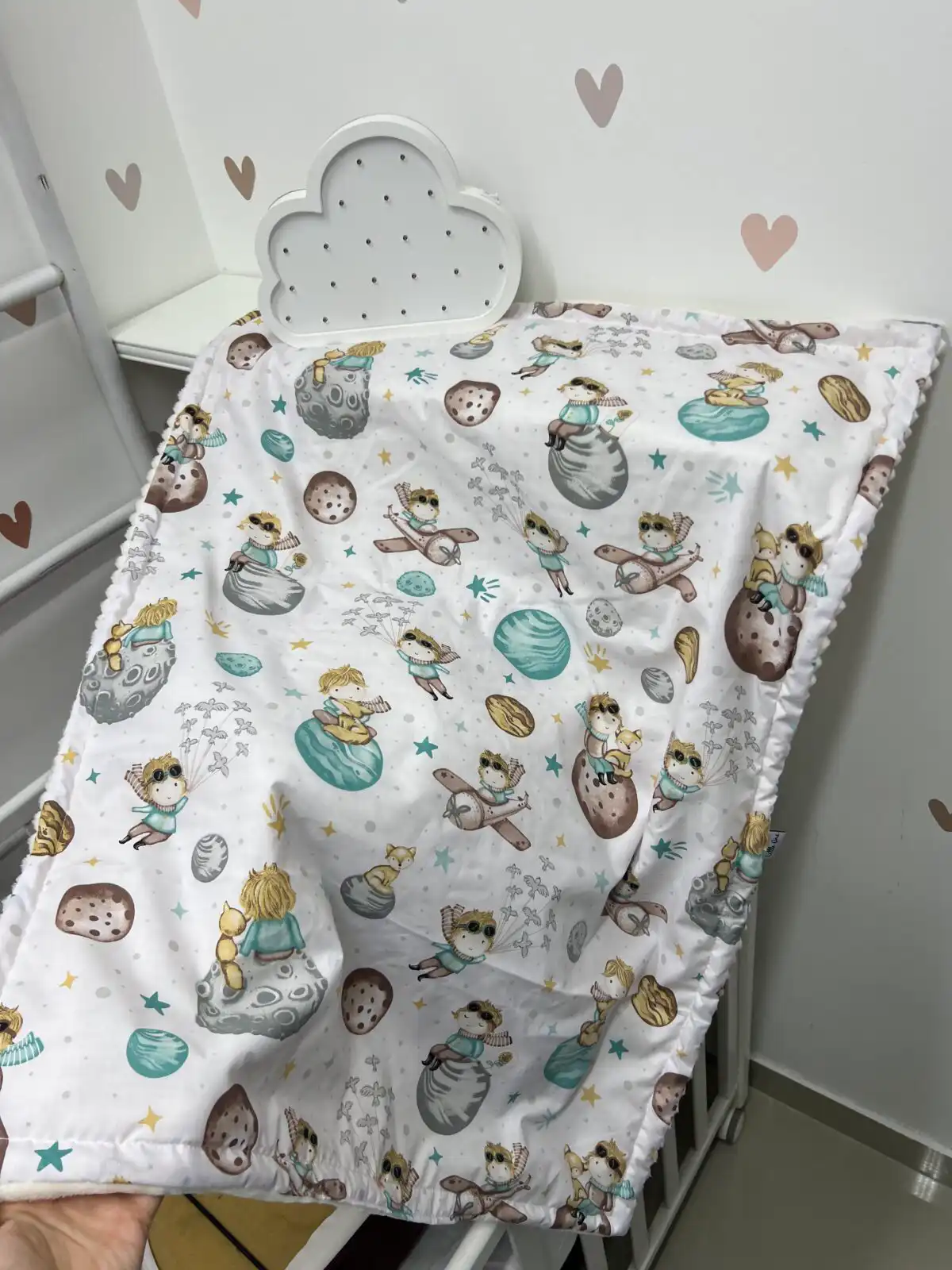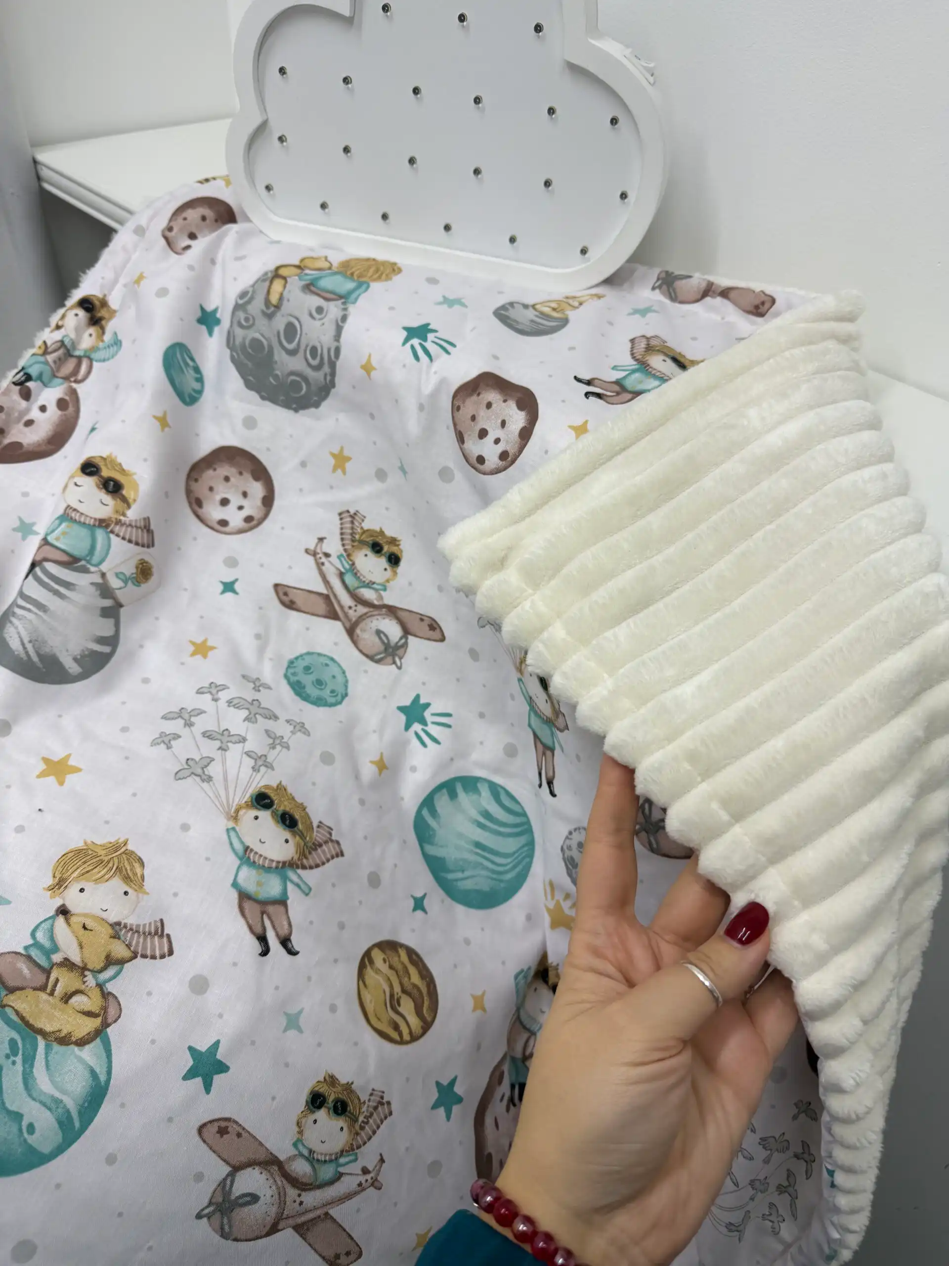 Prekrivač je izrađen sa jedne strane u nežnom dezenu, dok je sa druge strane mekan polar, poput ćebenceta, koji pruža dodatnu toplinu i ušuškanost 👶✨