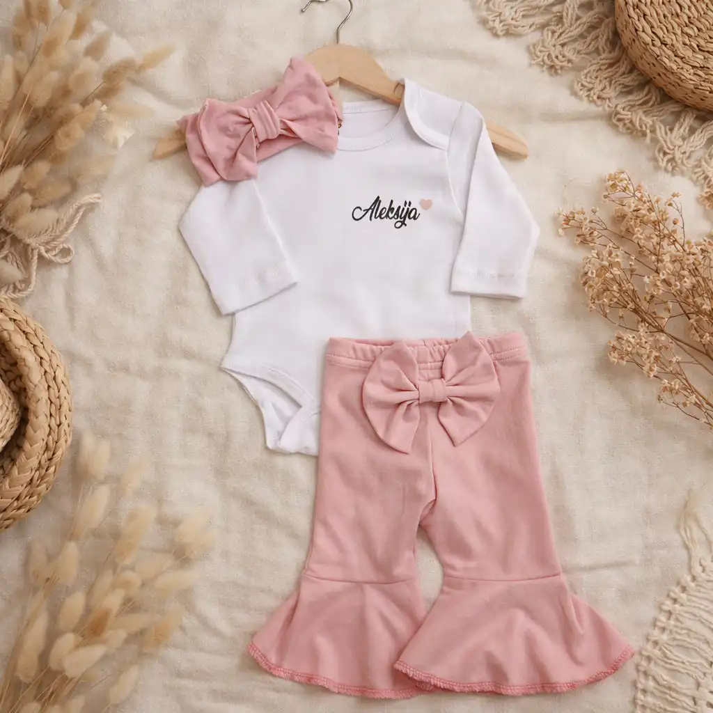 Komplet za bebu bodić sa imenom, zvonarice i trakica predstavlja idealan izbor za roditelje koji traže personalizovanu i udobnu garderobu za najmlađe 👶. Set je izrađen od kvalitetnog pamuka koji je nežan prema osetljivoj bebinoj koži, prozračan i prijatan za celodnevno nošenje. Personalizovani bodić sa imenom daje poseban i unikatan izgled, dok zvonarice sa elastičnim pojasom omogućavaju slobodu pokreta i maksimalnu udobnost. Usklađena trakica za kosu upotpunjuje outfit i čini ga savršenim za fotografisanje, poklon ili posebne prilike 🎁.