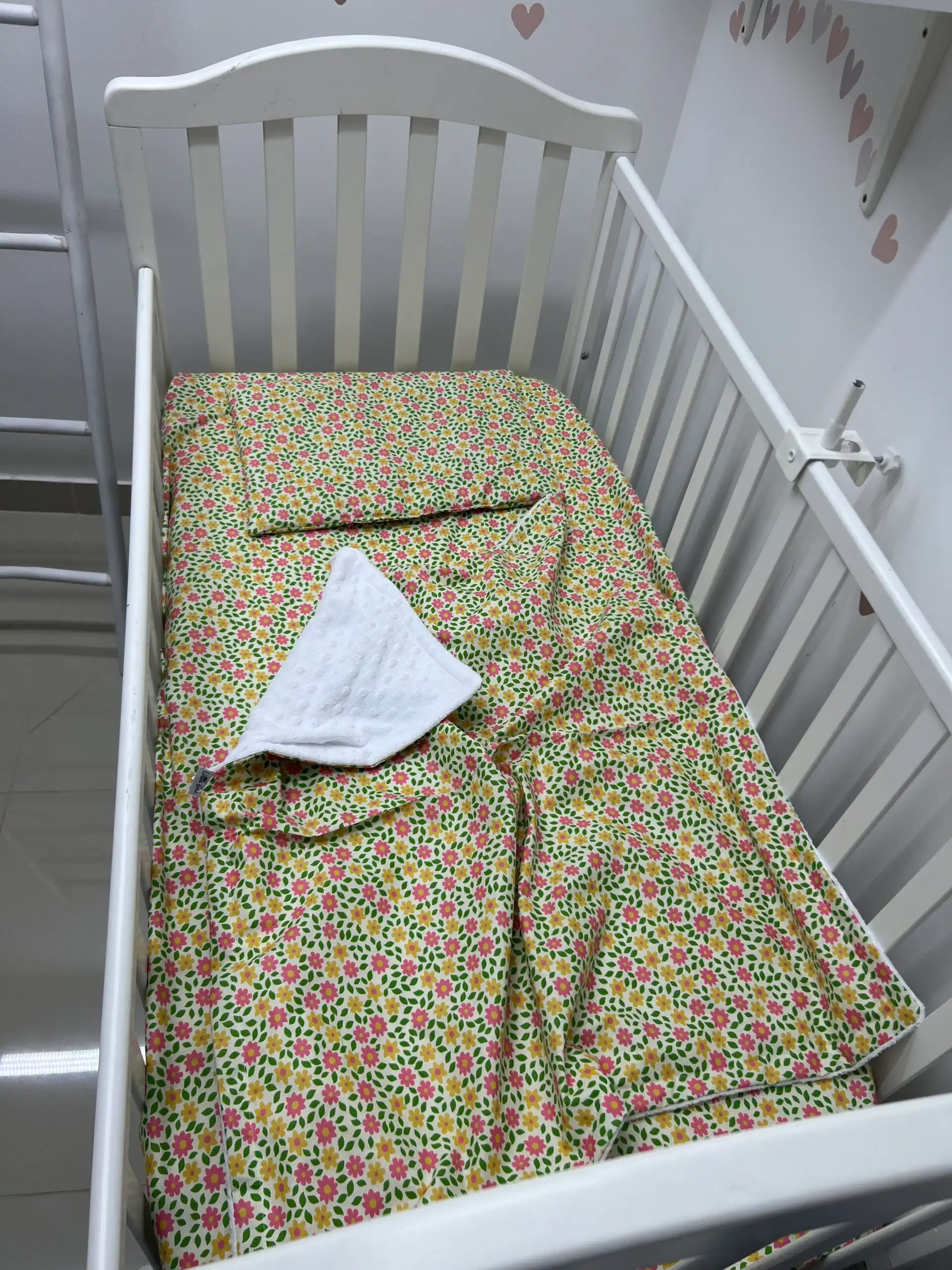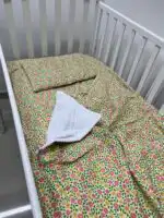 Veseli i udobni set za krevetac – dušečni čaršaf sa lastišem, ravno jastuče i prekrivač u šarenim bojama za prve snove pune nežnosti.