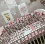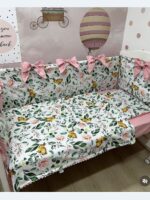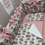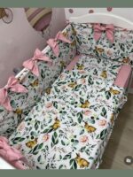 Set uključuje ogradicu za tri strane sa mašnama, čaršaf za dušek sa lastišem, prekrivač i ravni jastuk. 🛏️✨