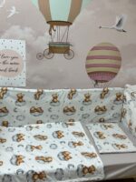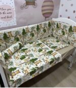 Set sadrži ogradicu za tri strane 🛏️, čaršav za dušek sa lastišem 🌟, prekrivač i ravni jastuk 🌙.