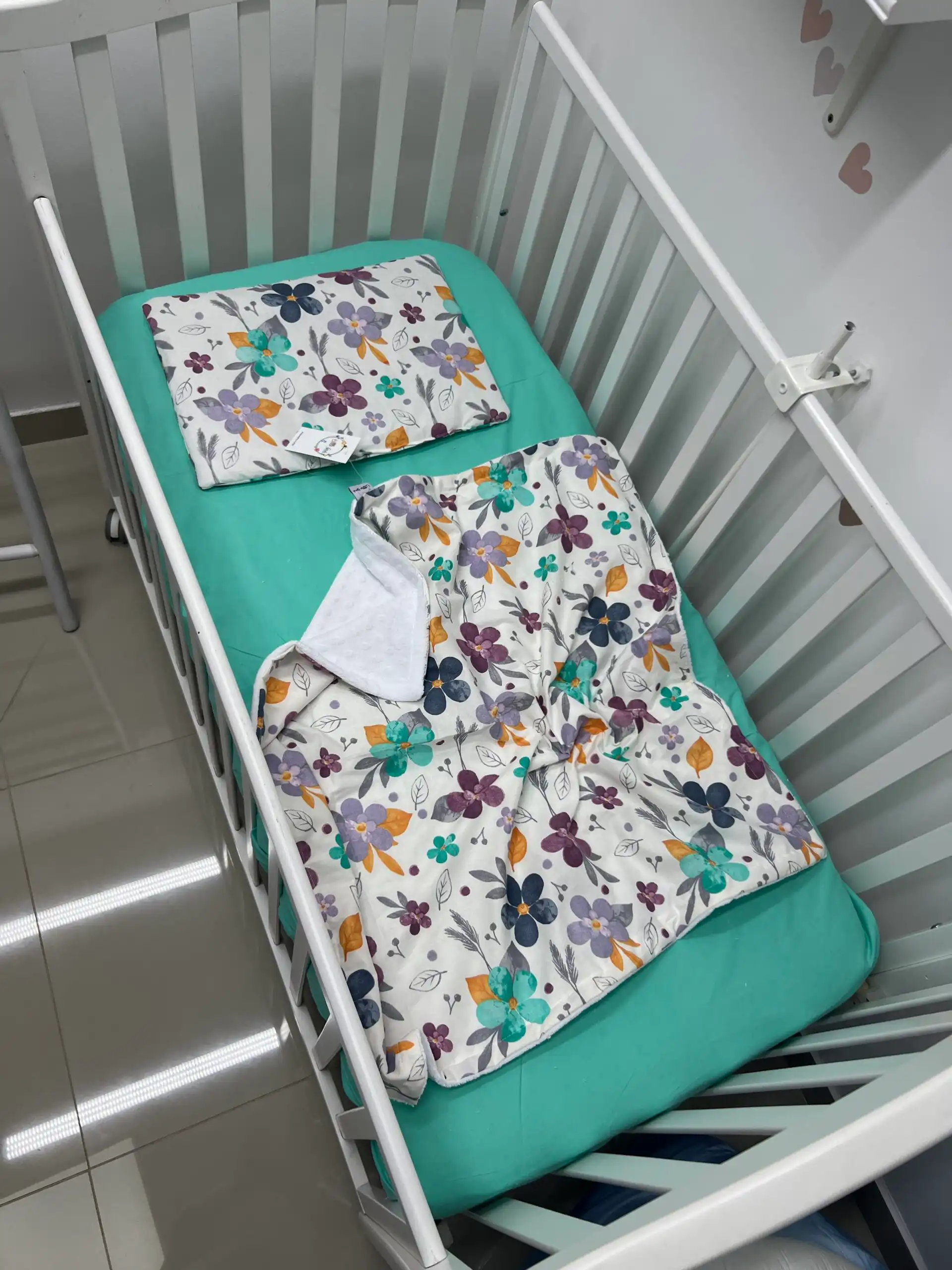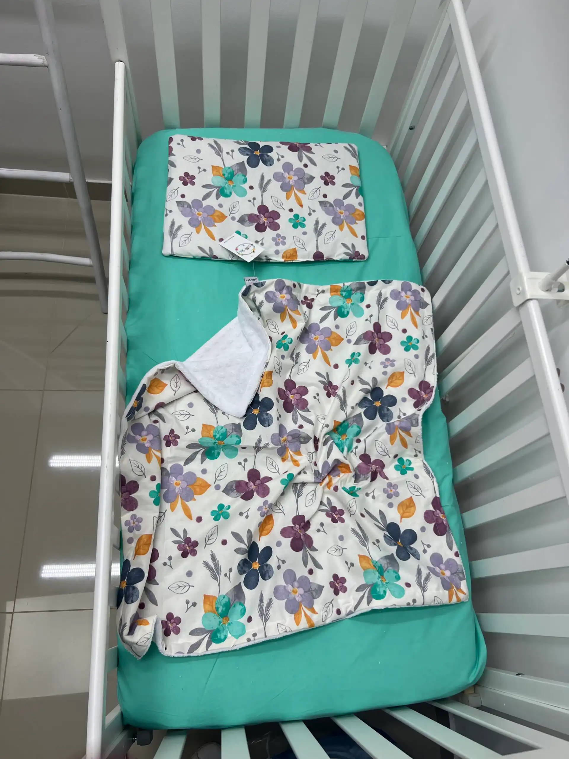 Veseli i udobni set za kolevku – dušečni čaršaf sa lastišem, ravno jastuče i prekrivač u šarenim bojama za prve snove pune nežnosti.