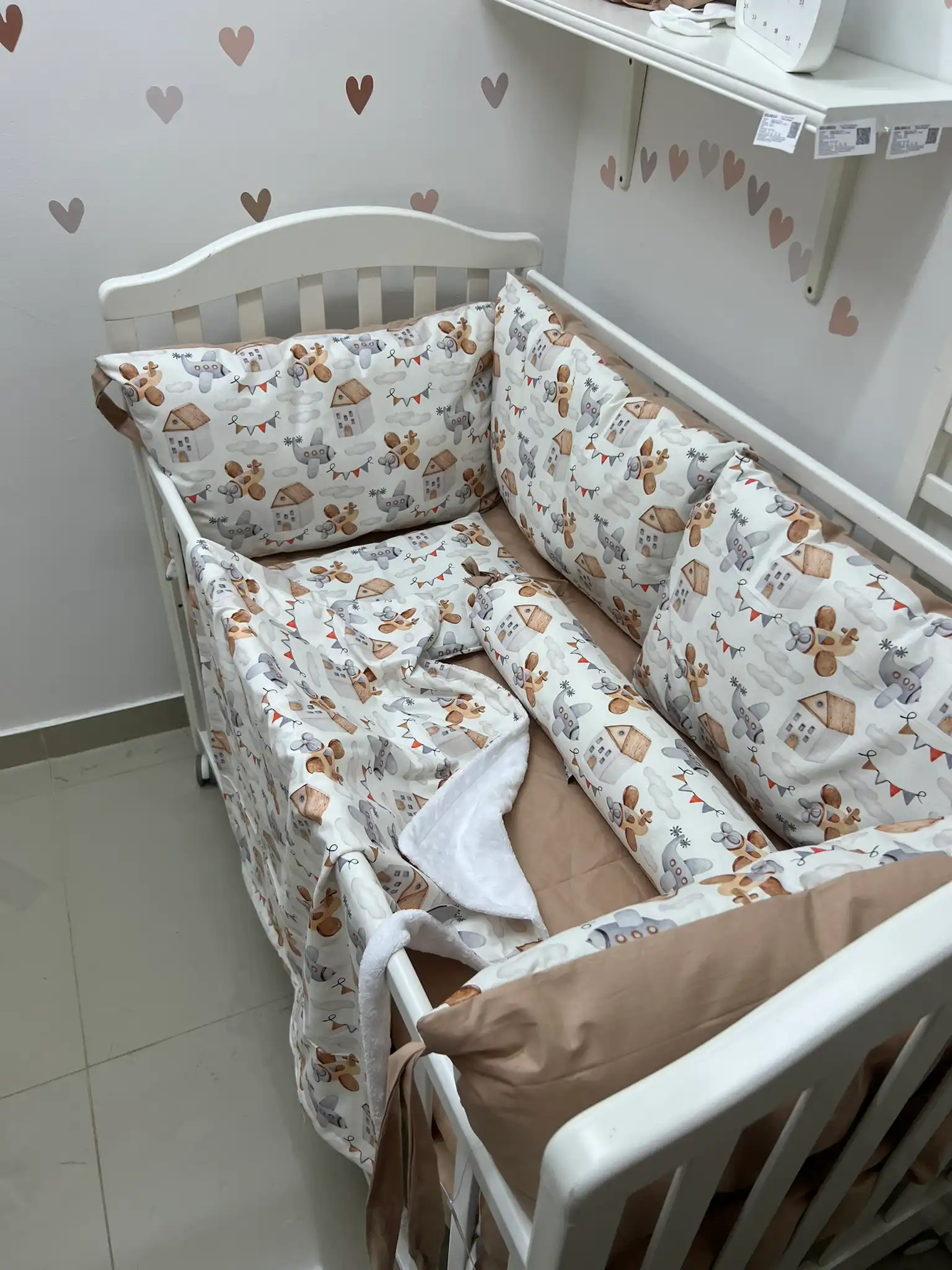 Posteljina i jastučići sastoje se od jastuka za tri strane kreveta, koji su opremljeni vezicama za pričvršćivanje. Uz to, set uključuje dušečni čaršafom na lastišem, prekrivač i ravan jastuk. Odgovara za krevetac standardnih dimenzija – 120*60cm.